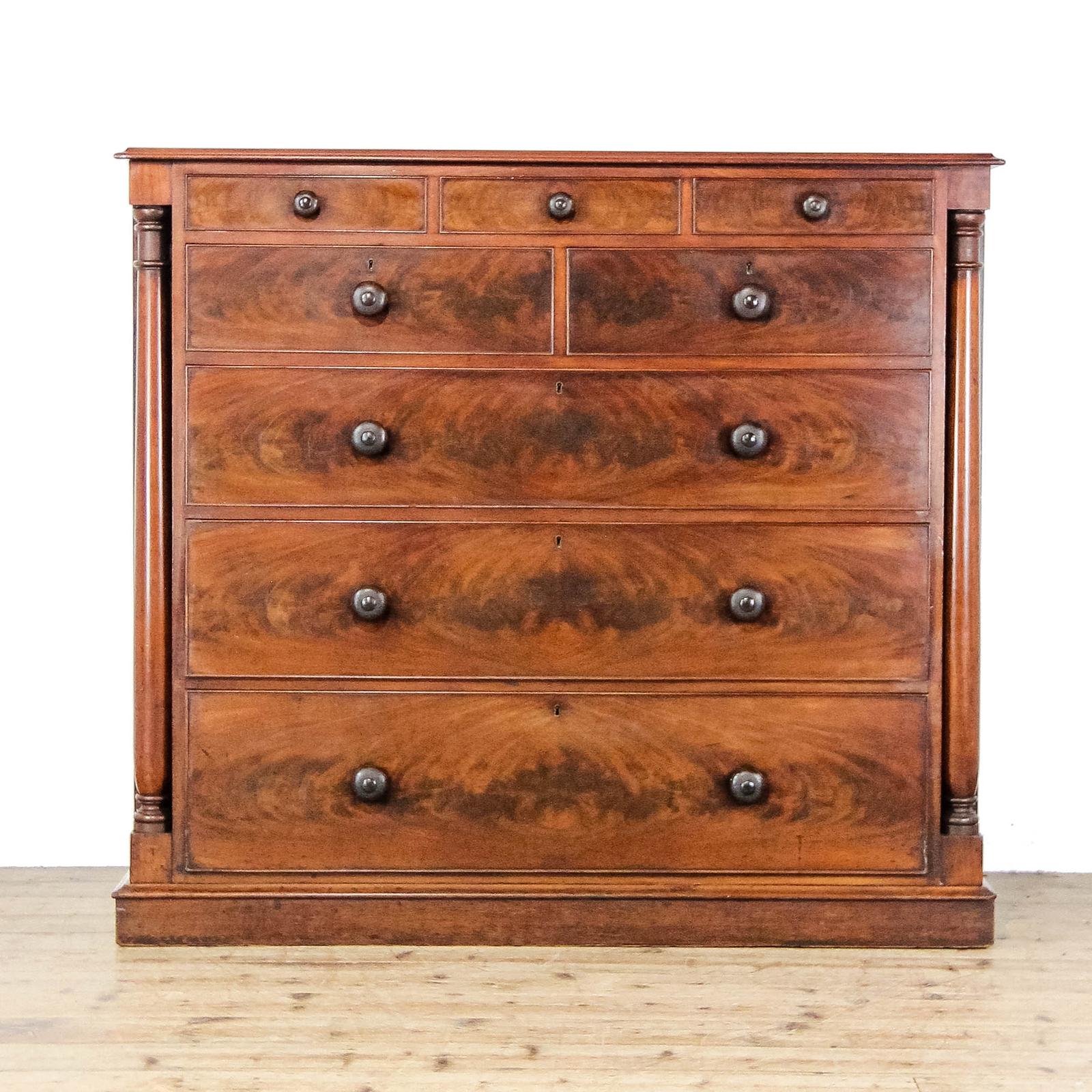 Large Victorian mahogany chest of drawers with lovely flame figuring across the drawer fronts. The arrangement comprises three small drawers over two short drawers and three long graduated drawers below. Fitted with turned wooden knobs and flanked by turned front pillars, giving it a smart and well-balanced look. A handsome and useful 19th-century piece with good colour and presence.