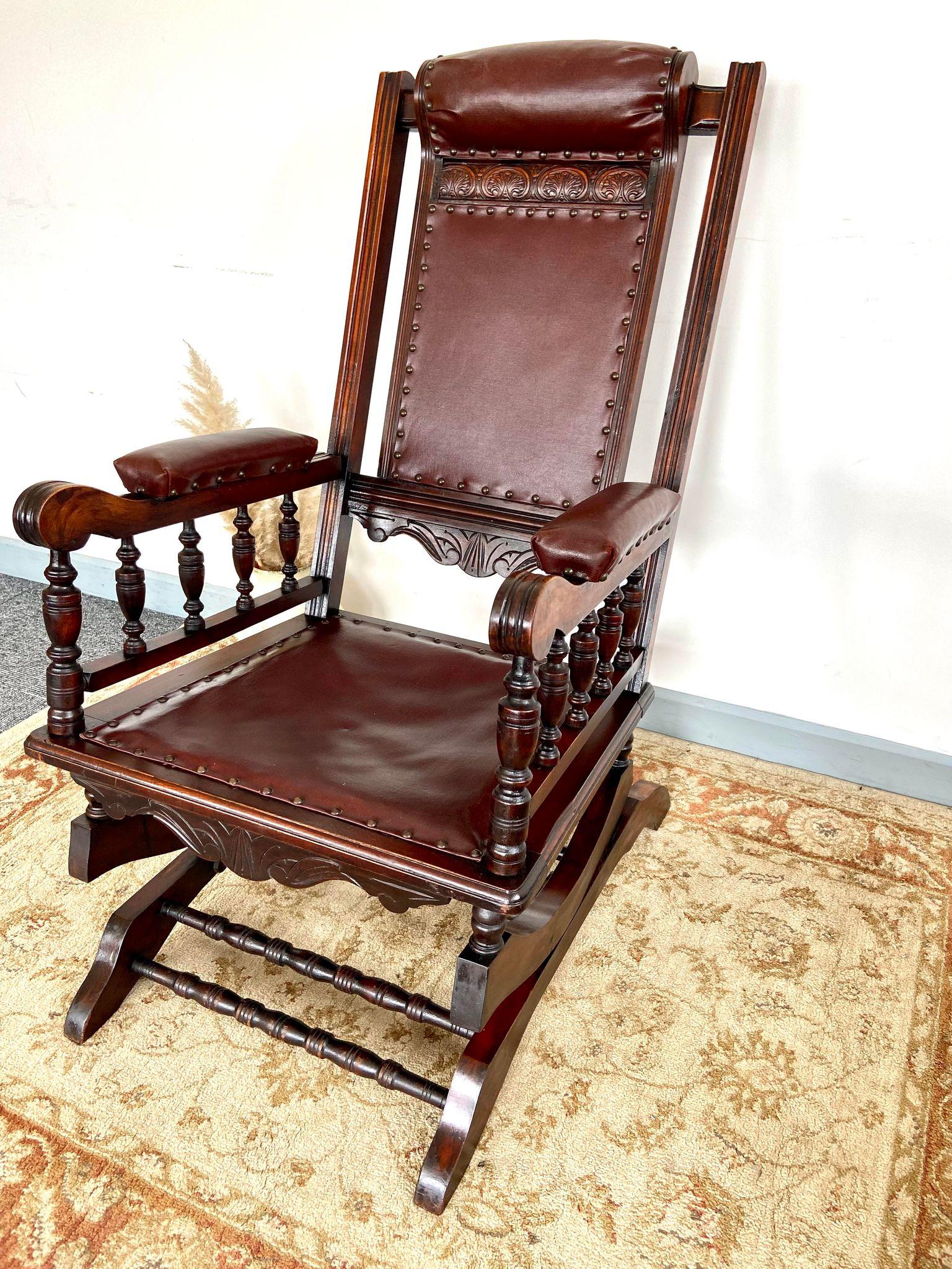 Antique Victorian Leather Rocking Chair - Solid Oak & Leather - Made in England c.1890