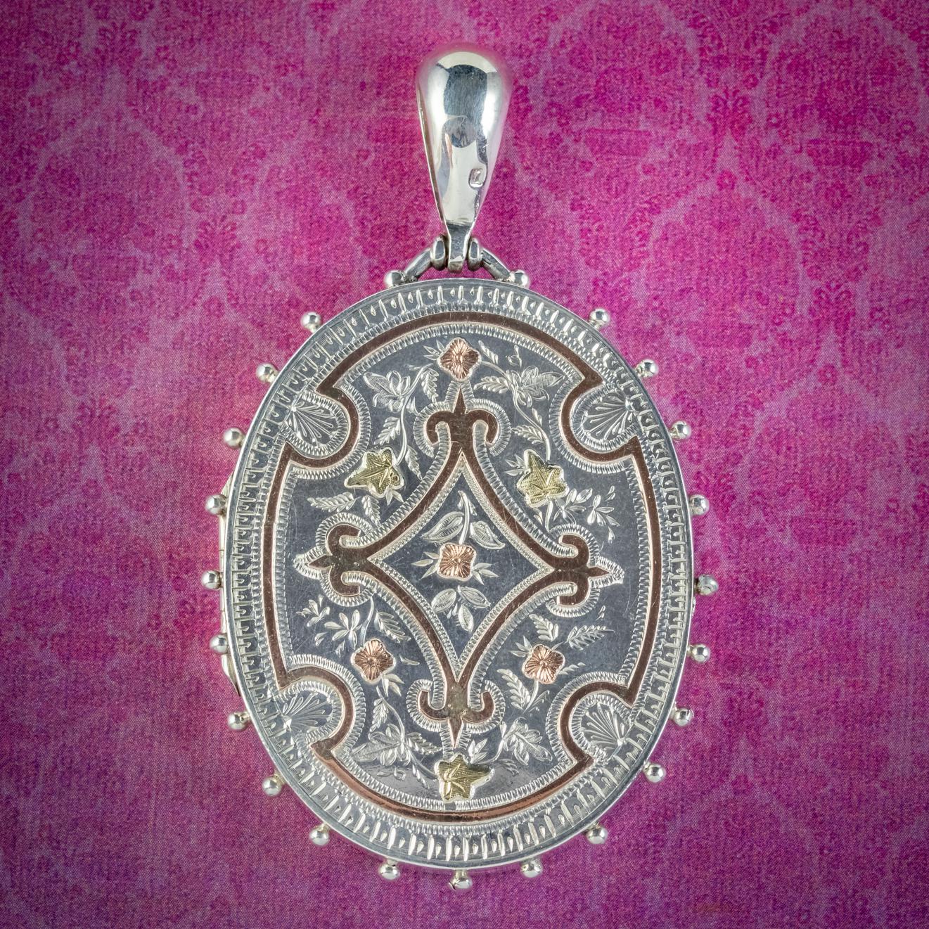 Antique Victorian Locket Sterling Silver Gold Forgets Me Nots & Ivy c.1880