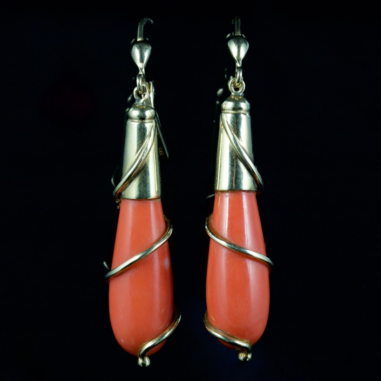 Antique Victorian Long Coral Earrings 14ct Gold c.1900