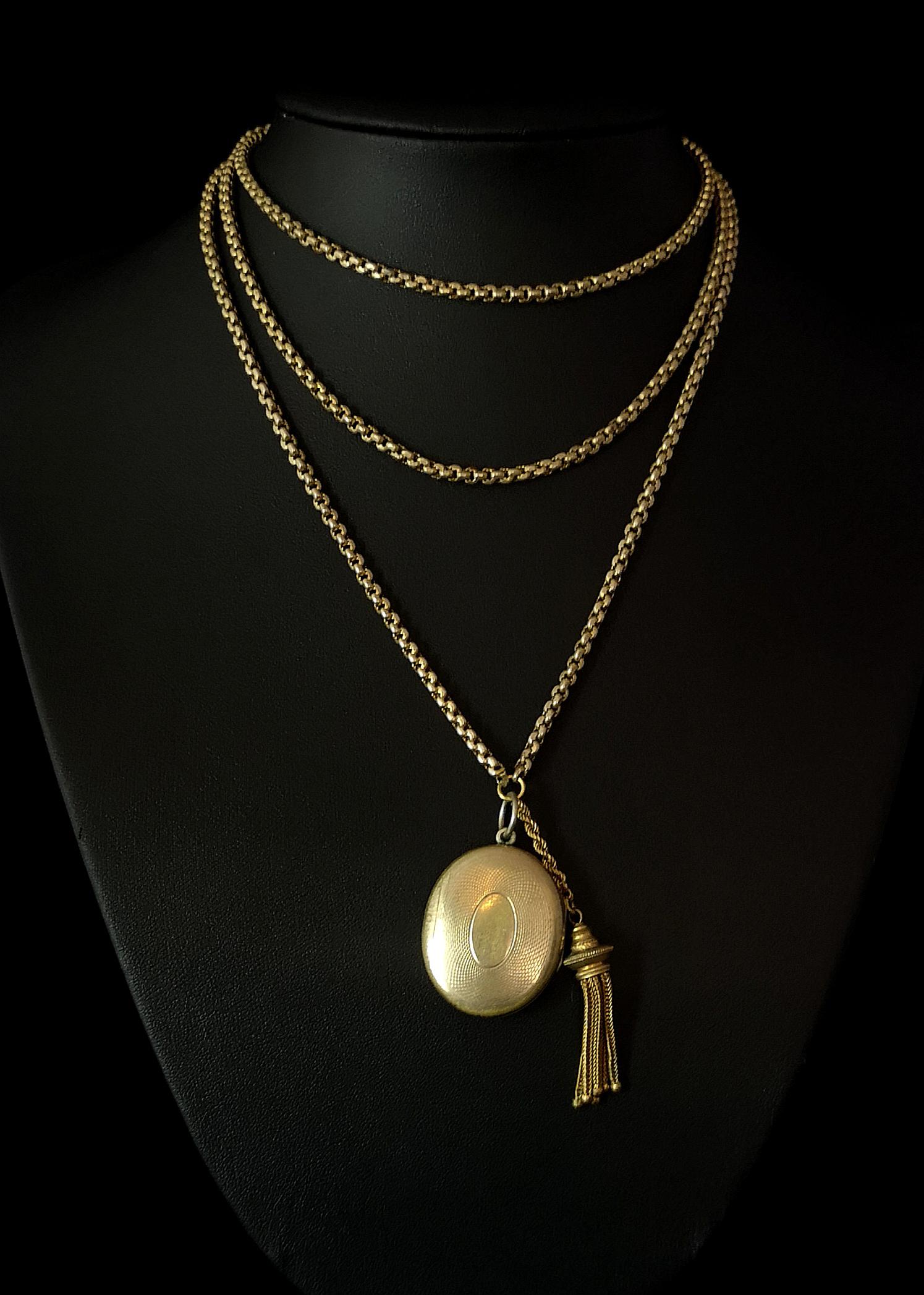 Antique Victorian Longuard Chain, Muff Chain Necklace, Locket & Tassle