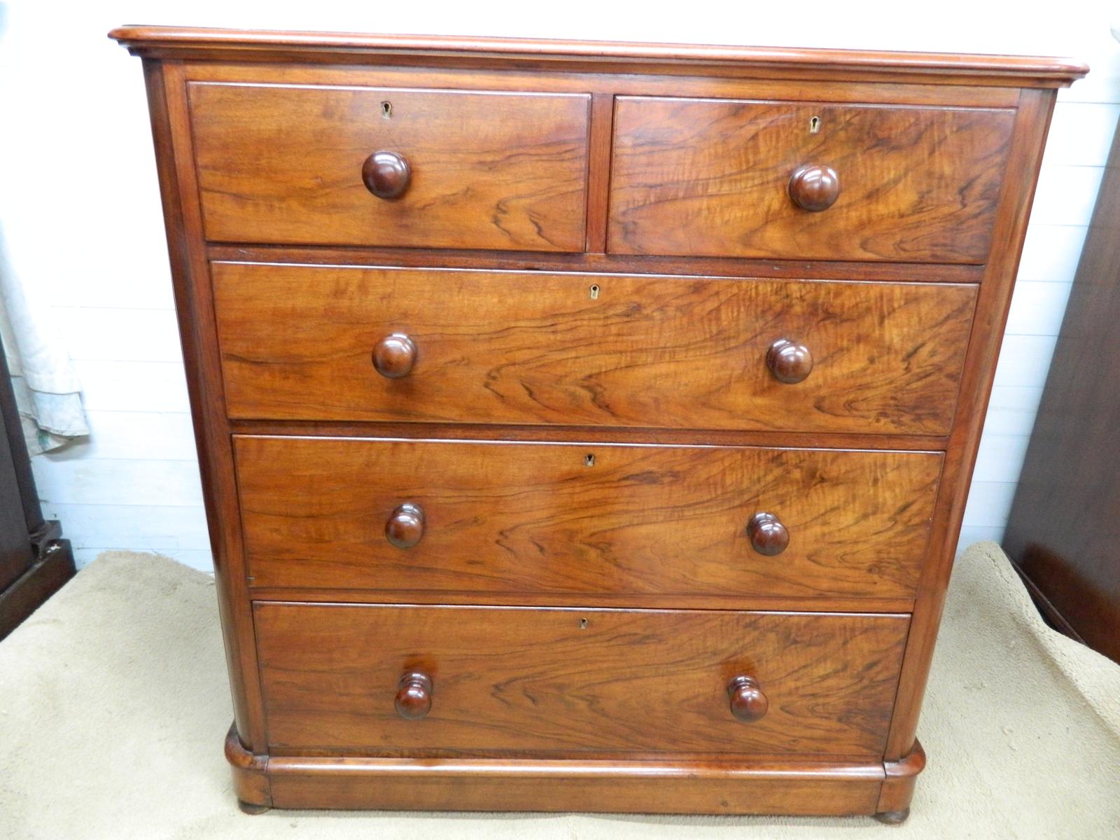 The chest has 2 short over 3 long graduating drawers, all slide freely, the drawers are also made from mahogany making them very strong, some drawer linings have been in them before, all locks are in place no keys, with original bun handles. The fronts of the drawers have a very nice grain showing, adding that extra piece of elegance. There is small heat crack to the side, from radiator heat, something they never had 150 years ago. The chest will last another 150 years with just age related marks. Please see all pictures for condition.