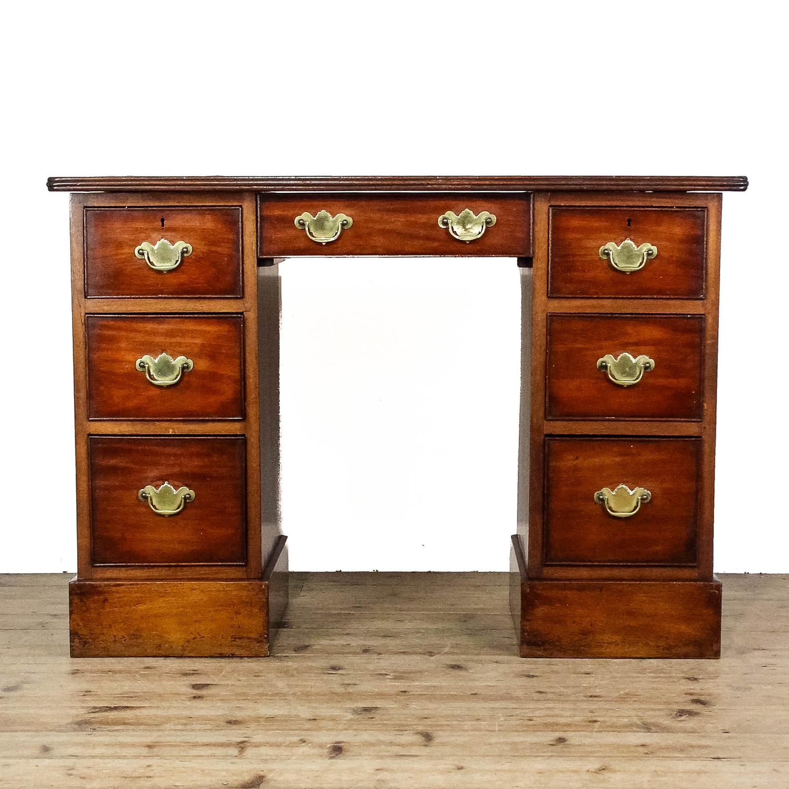In good antique condition throughout with signs of age. There is surface wear in places, including age-related mark and scratches. The leather writing surface shows wear, scuffing, and rubbing to the surface and gilt tooling, consistent with use (pictured). There are small knocks and abrasions to the plinth bases and corners, along with general patination throughout. All drawers run well and the desk remains structurally solid and sound.