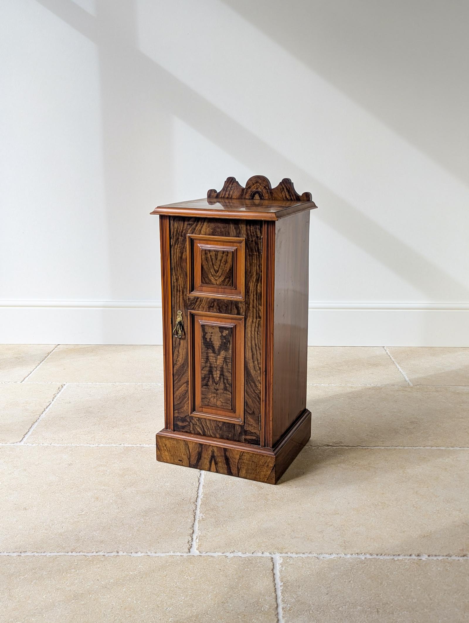 A late Victorian bedside cupboard with particularly impressive, highly figured exotic hardwood veneers to the top and front, with mahogany to the sides. The moulded top features a shaped gallery back and is set over the single door with moulded fielded panels framed by reeded stiles and opening to a single raised shelf, all raised on a plinth base.