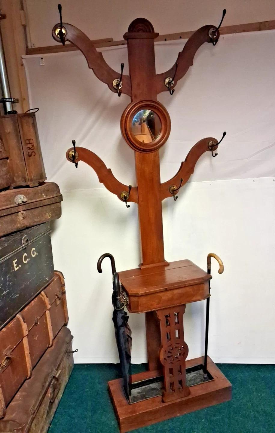 Antique Victorian Mahogany Hat Coat Tree Hall Stand with Original Brass Hooks