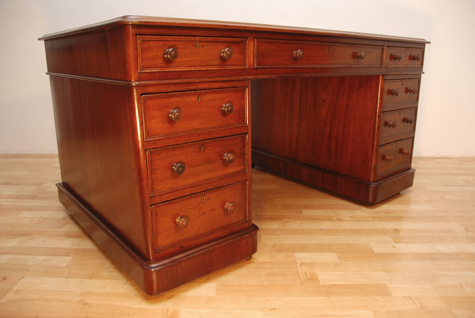 Antique Victorian Mahogany Writing Pedestal Desk Black Leather Top
