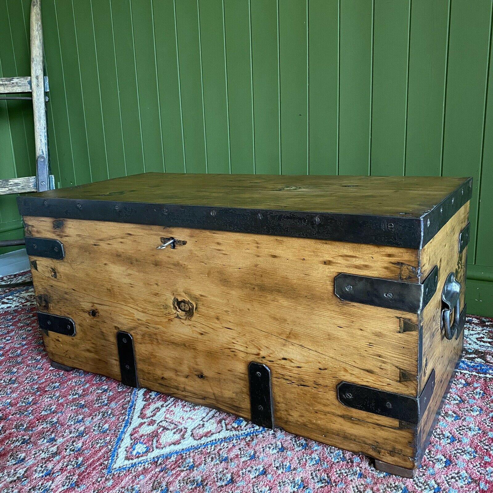 Antique Victorian Military Chest Old Rustic Pine Wooden Storage Trunk + Key
