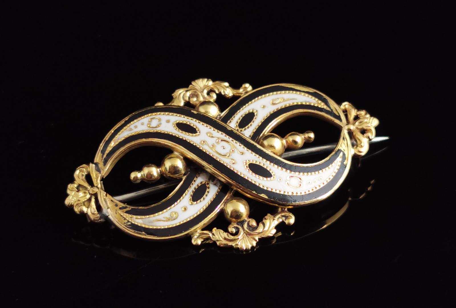 Antique Victorian Mourning Brooch, 15ct Gold Black & White Enamel