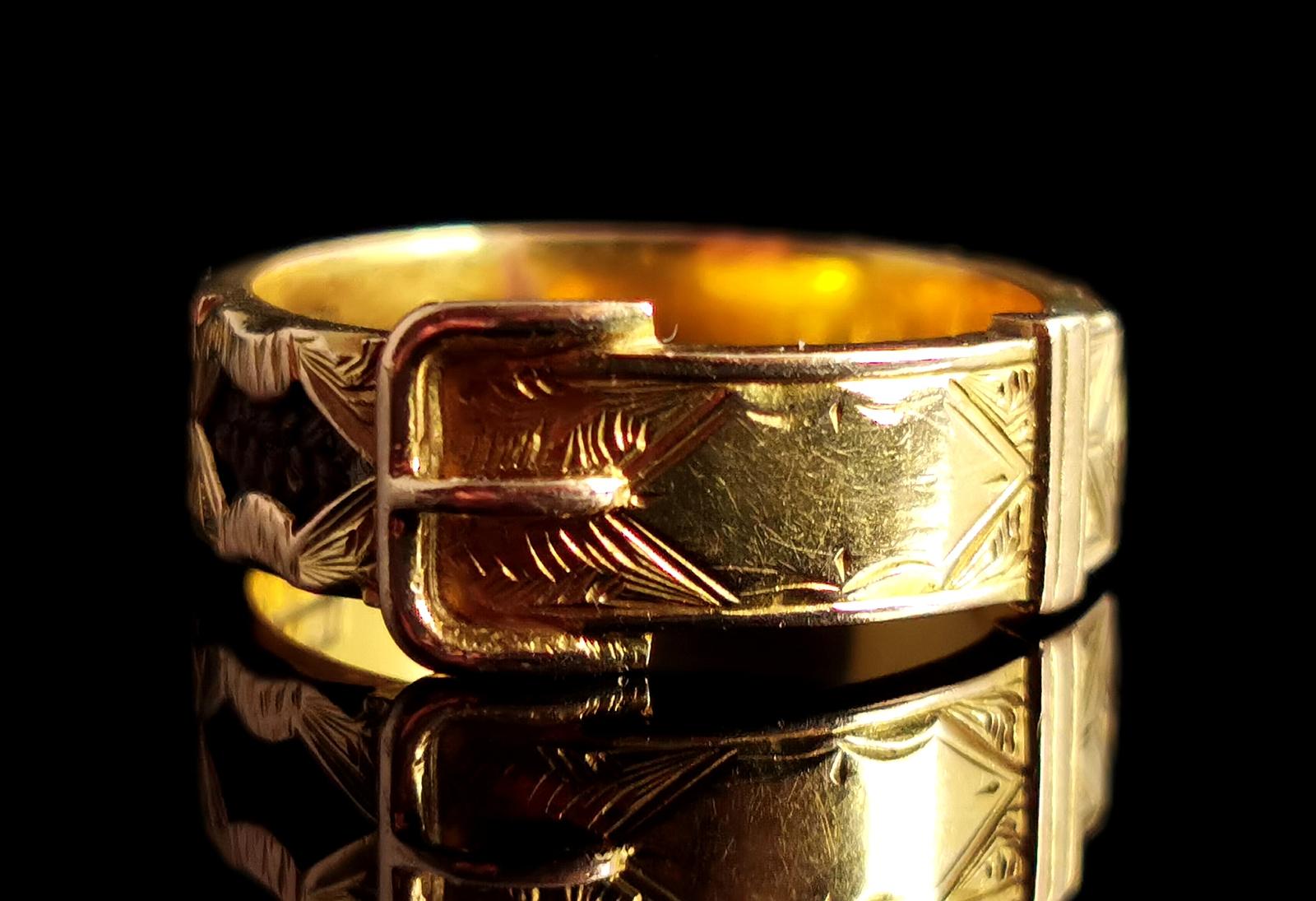 Antique Victorian Mourning Buckle Ring, 15ct Gold, Hairwork