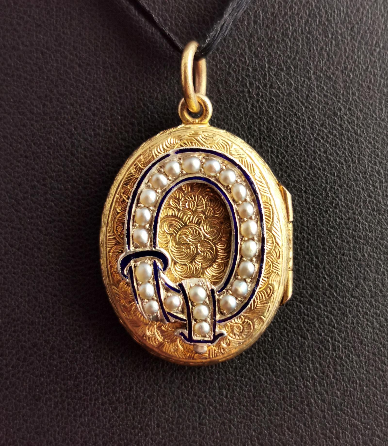 Antique Victorian Mourning Locket, 9ct Gold, Pearl Buckle, Blue Enamel