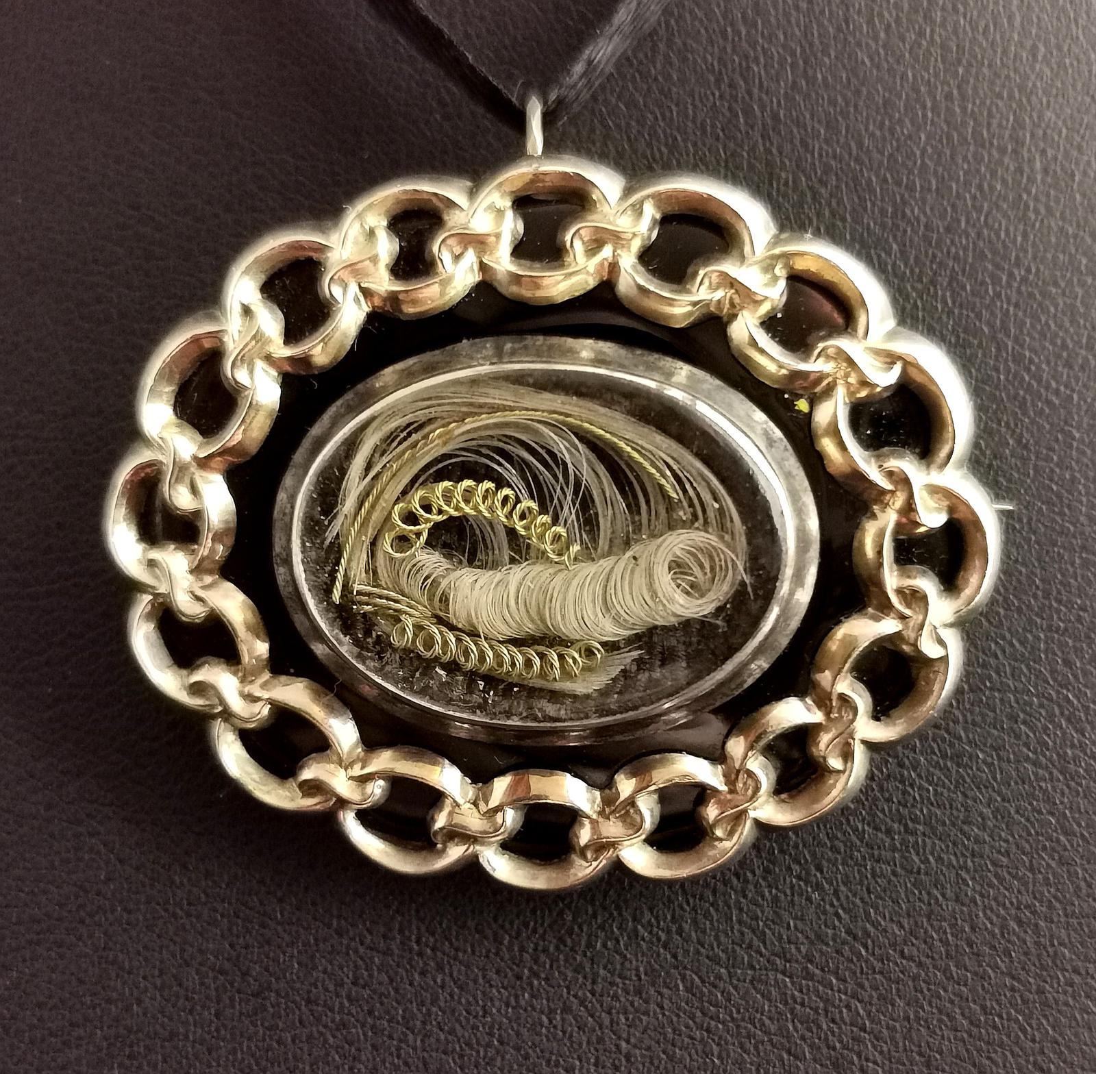 Antique Victorian Mourning Pendant Brooch, 9ct Gold, Onyx & Hairwork