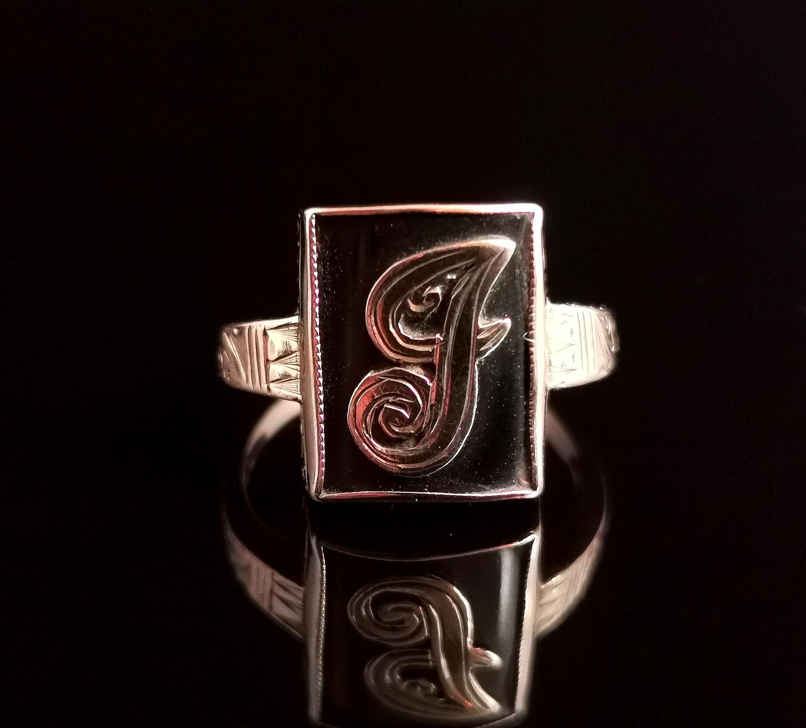 Antique Victorian Mourning Ring, Letter J Initial, 9ct Rose Gold & Onyx