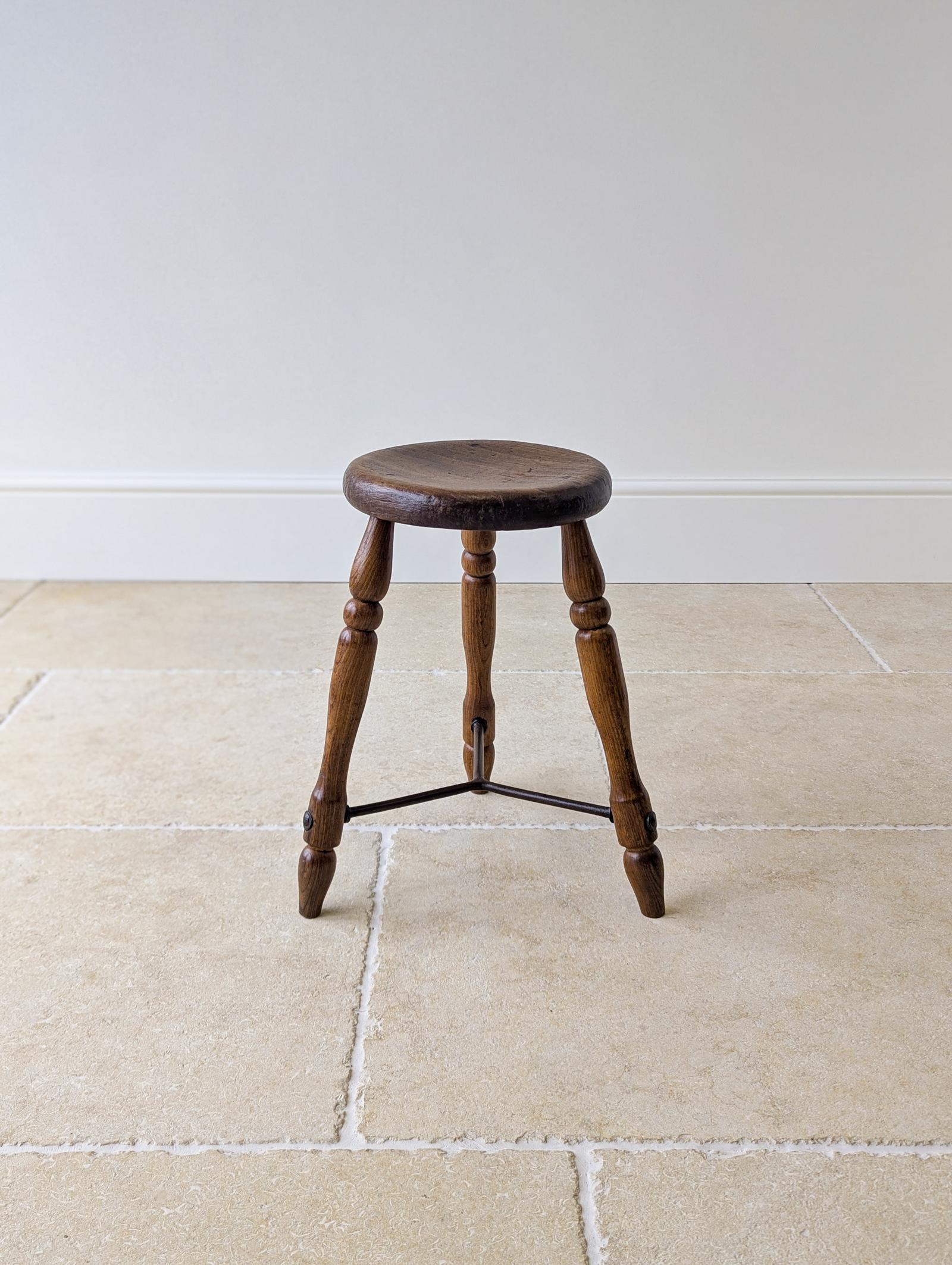 A characterful late 19th Century (circa 1880) English Victorian antique oak country stool, the thick round seat with softly worn edge is set over three well-turned legs united by an iron stretcher.
