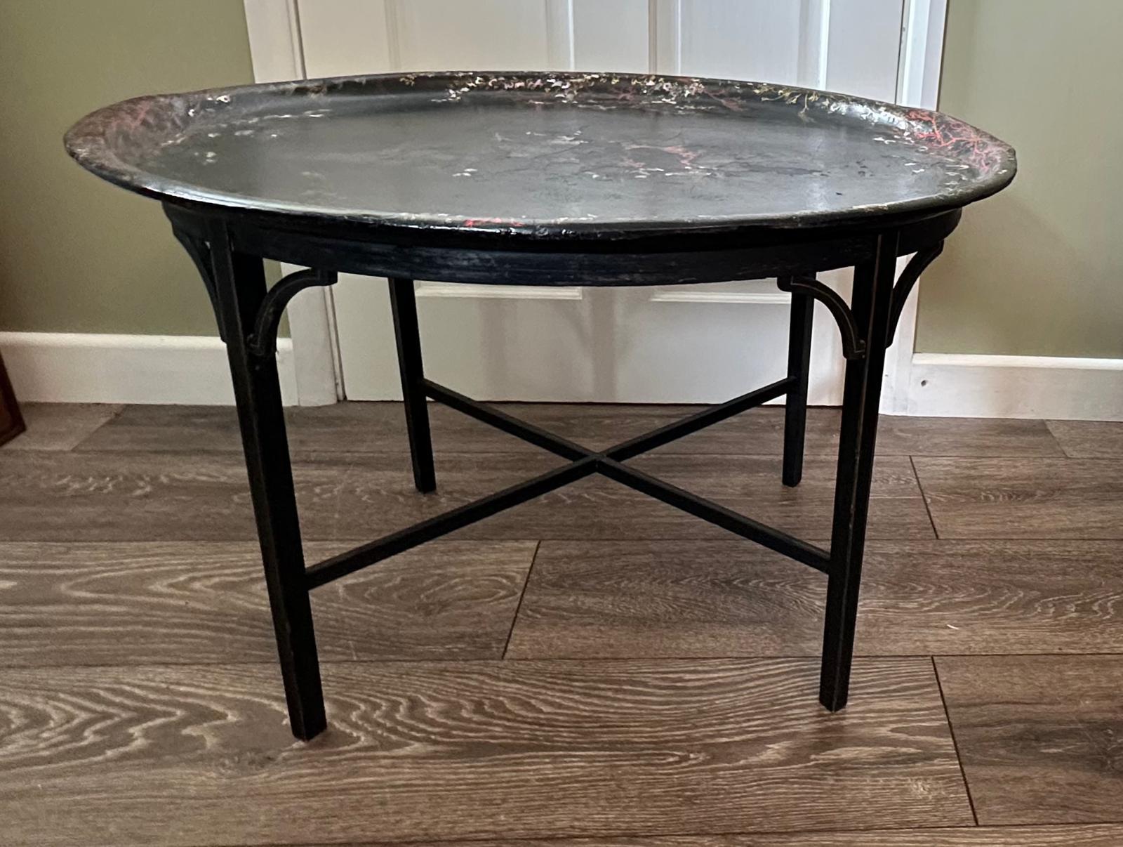 Antique Victorian Papier Mache Tray on Stand with Mother of Pearl Inlay