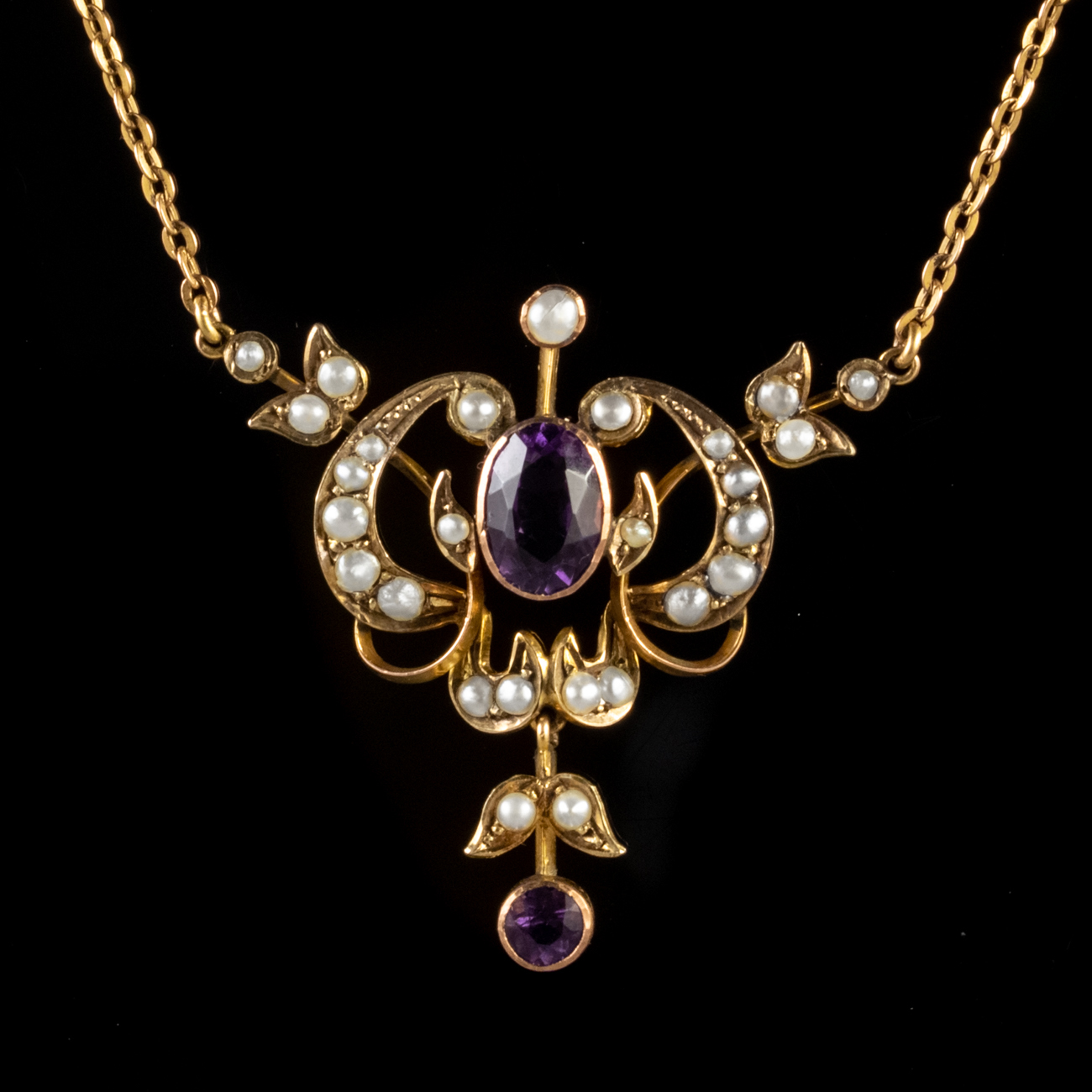 Antique Victorian Pearl Amethyst Pendant Necklace 9ct Gold C.1900