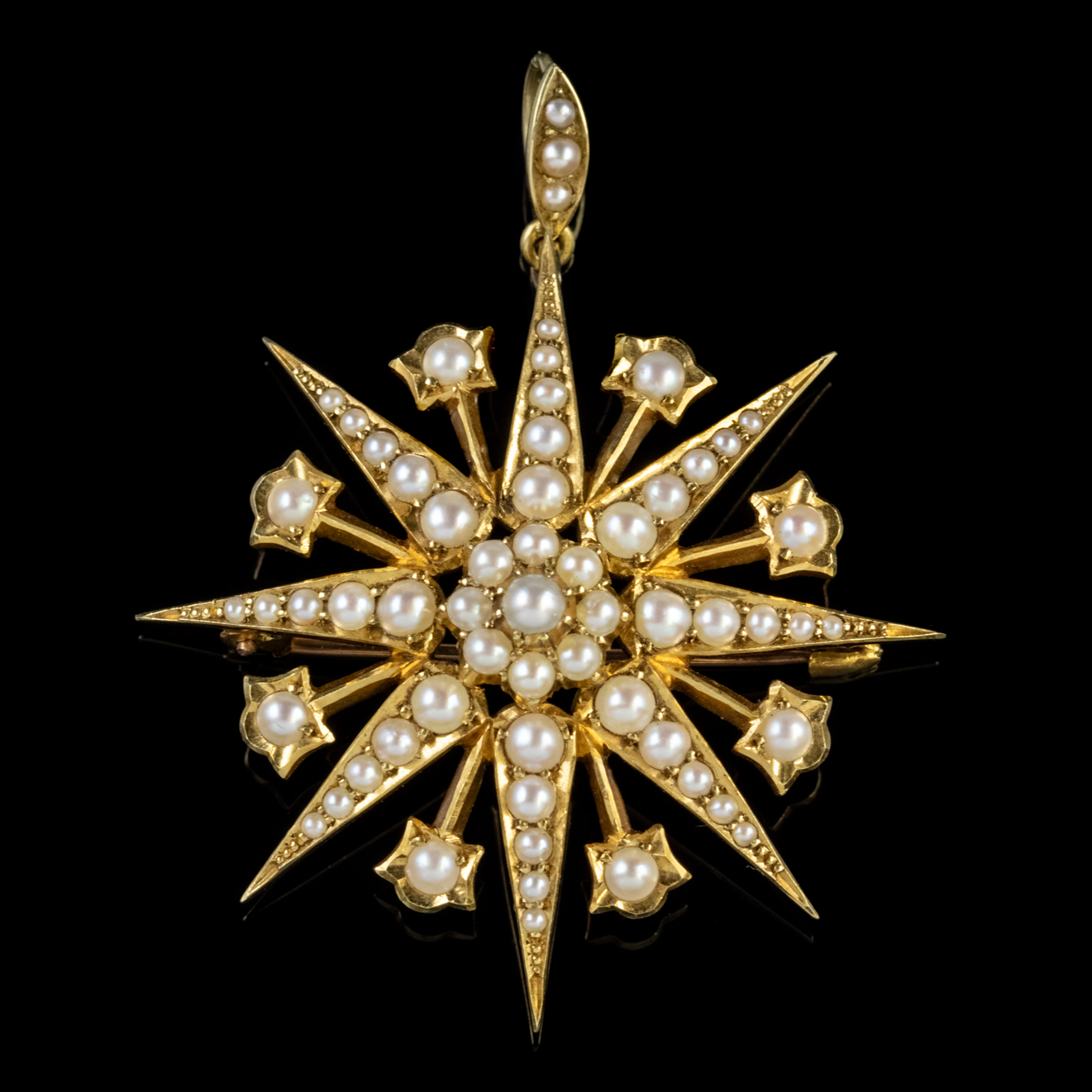 Antique Victorian Pearl Star Pendant Brooch 15ct Gold c.1900