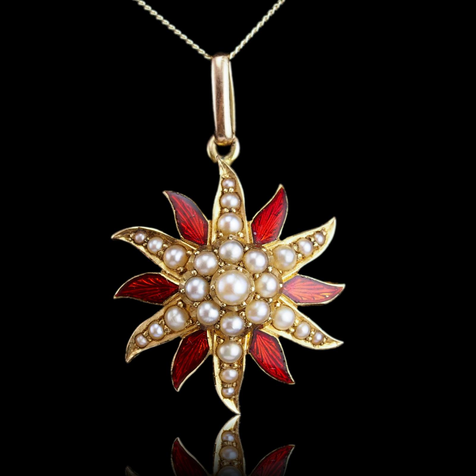 Antique Victorian Pearl Star Pendant Necklace with Red Enamel 15K Gold - c.1900 (1 of 15)
