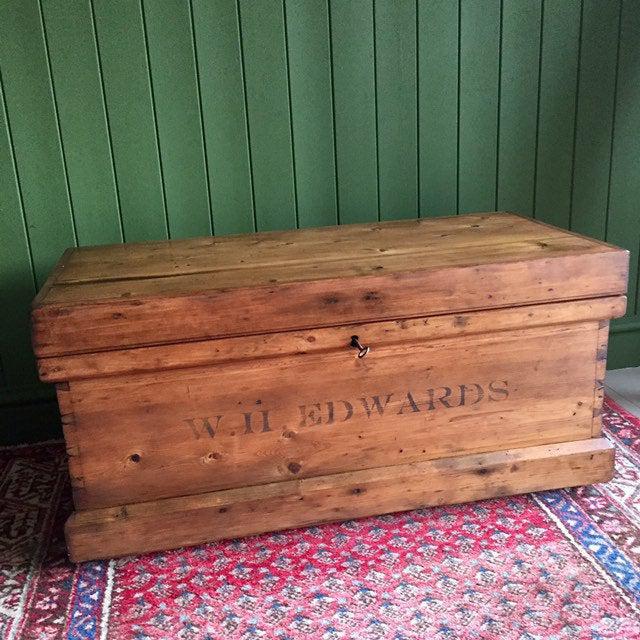 Antique Victorian Pine Chest Rustic Industrial Wooden Trunk + Key + Original Interior