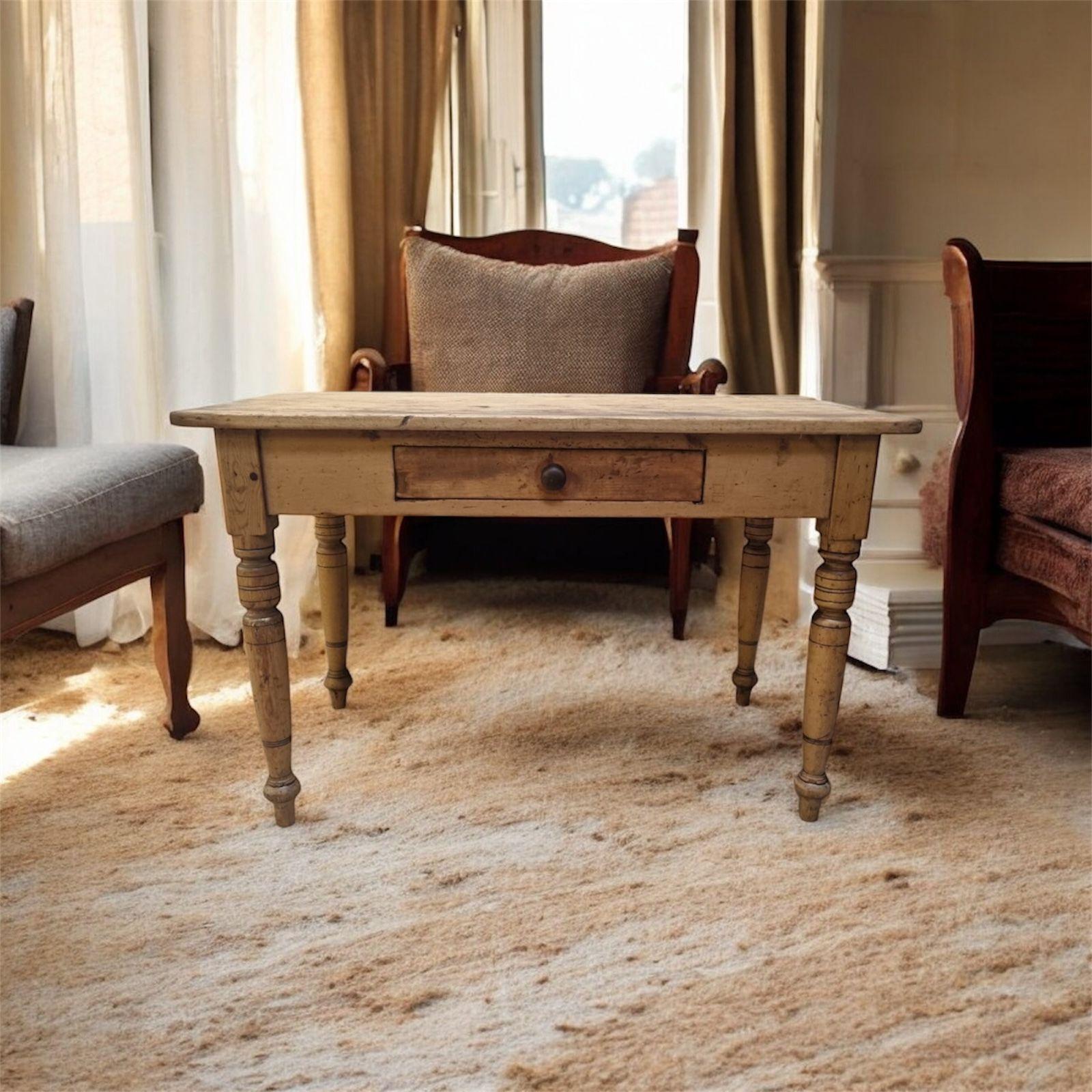 A charming antique pine farmhouse table in a warm, timeworn finish, featuring a single drawer with internal dividers ideal for cutlery, stationery or small household items.