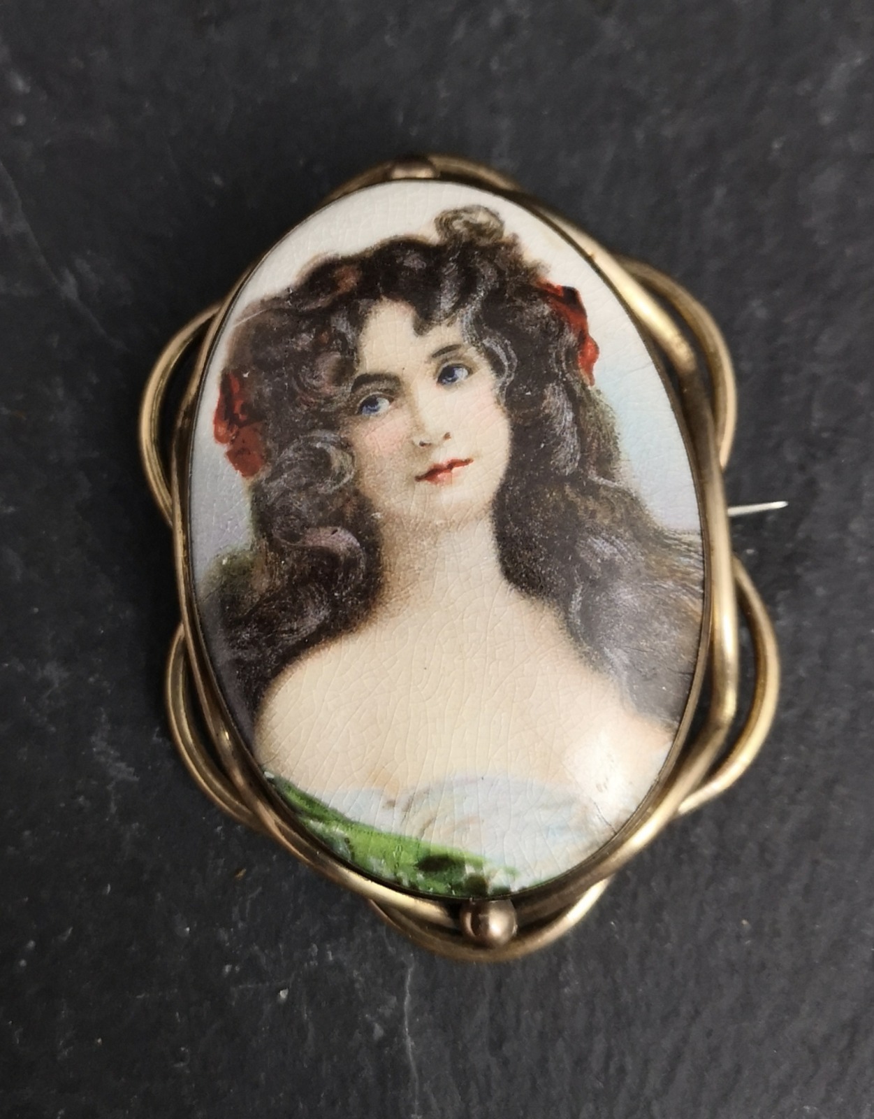 Antique Victorian Portrait Brooch, Pinchbeck & Porcelain