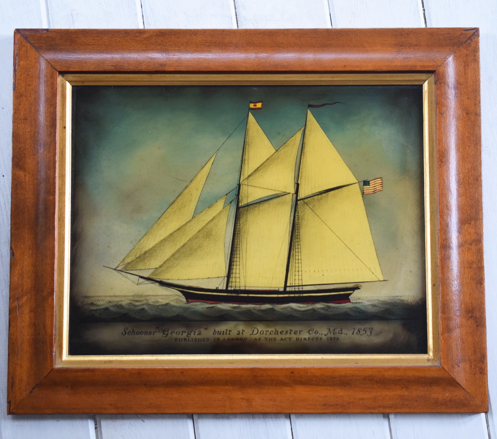 Antique Victorian Reverse Painted Glass Schooner 'Georgia' 1853