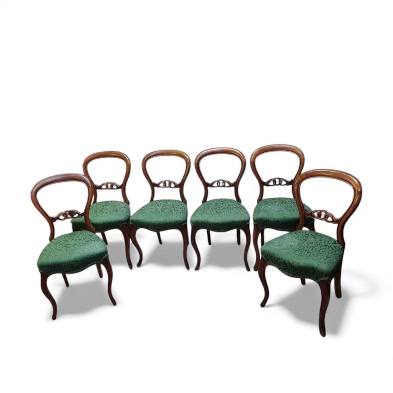 A beautiful and elegant set of six late 19th century dining chairs, crafted in the Victorian revival style. Each chair features a graceful carved balloon back with a decorative pierced splat, flowing cabriole legs and a well-proportioned upholstered seat.