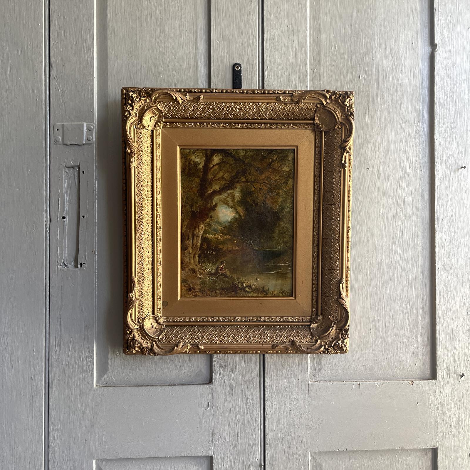 Antique Victorian River Landscape Oil Painting Study of Boy Fishing Angling