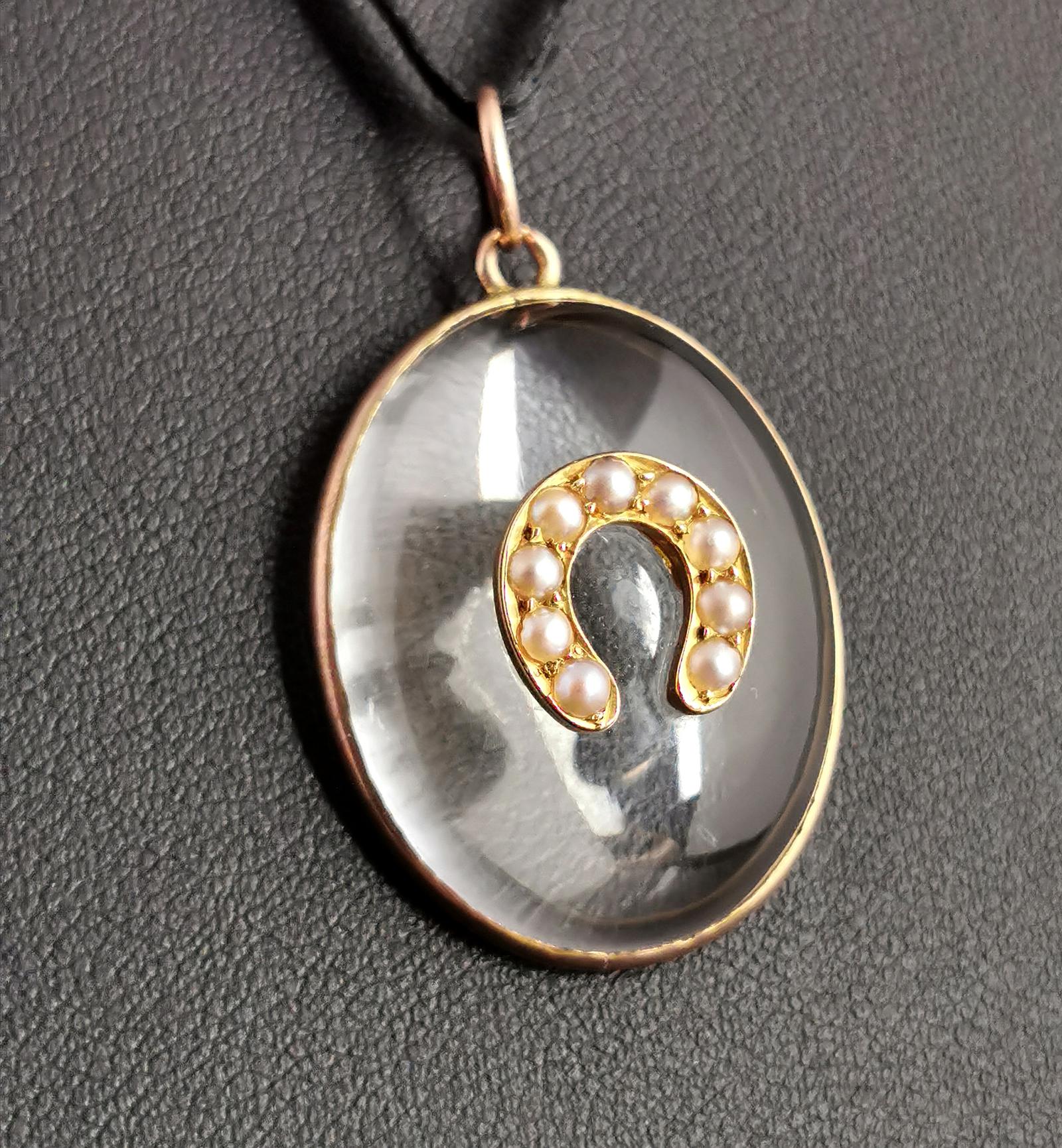 Antique Victorian Rock Crystal Pendant Gold Horseshoe, Split Pearl
