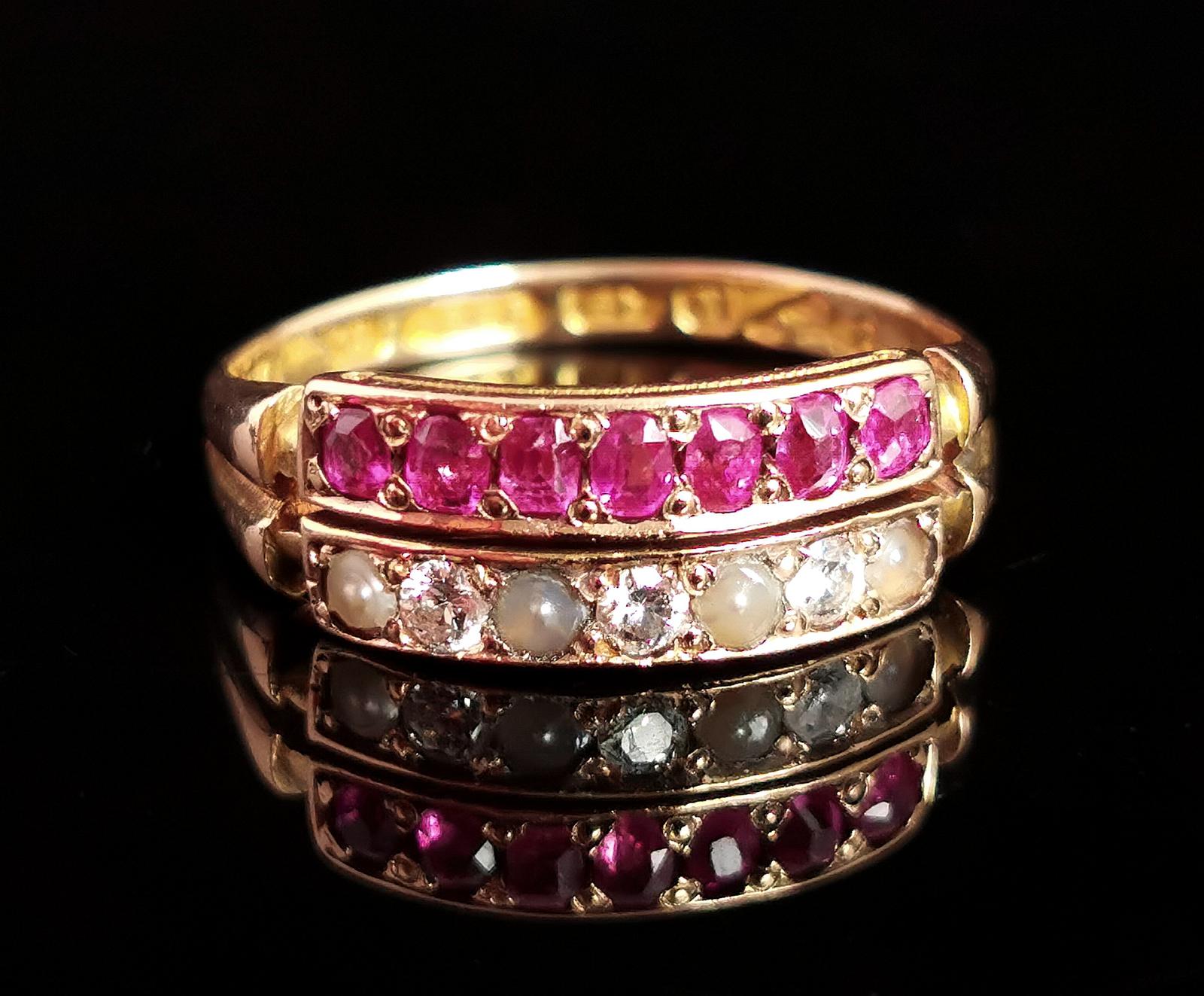 Antique Victorian Ruby, Diamond and Pearl Ring, Double Row, 15ct Gold