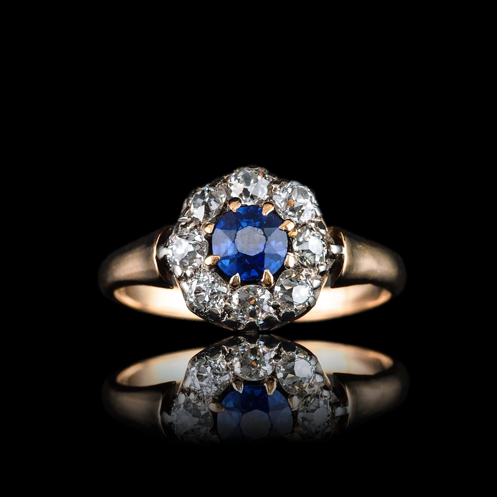 Antique Victorian Sapphire & Diamond 18ct Gold Cluster Ring - c.1900