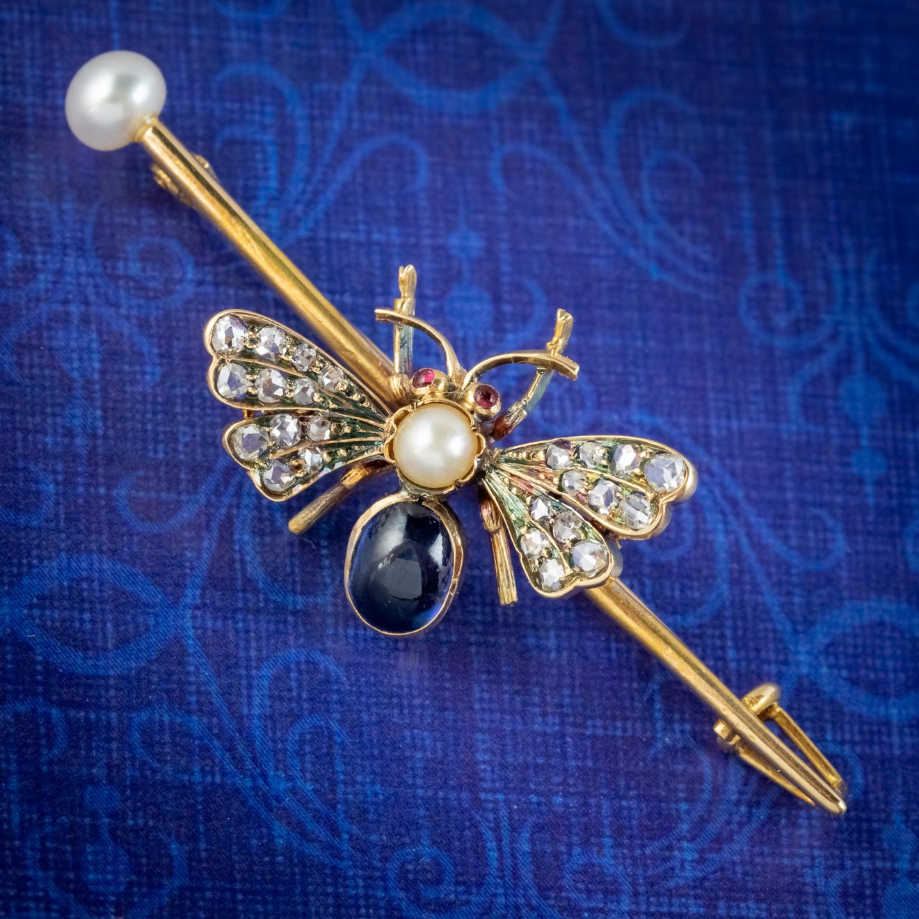 Antique Victorian Sapphire Diamond Pearl Bee Brooch 18ct Gold c.1900