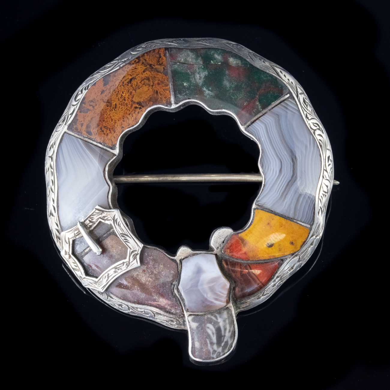 Antique Victorian Scottish Agate Buckle Brooch Silver c.1860
