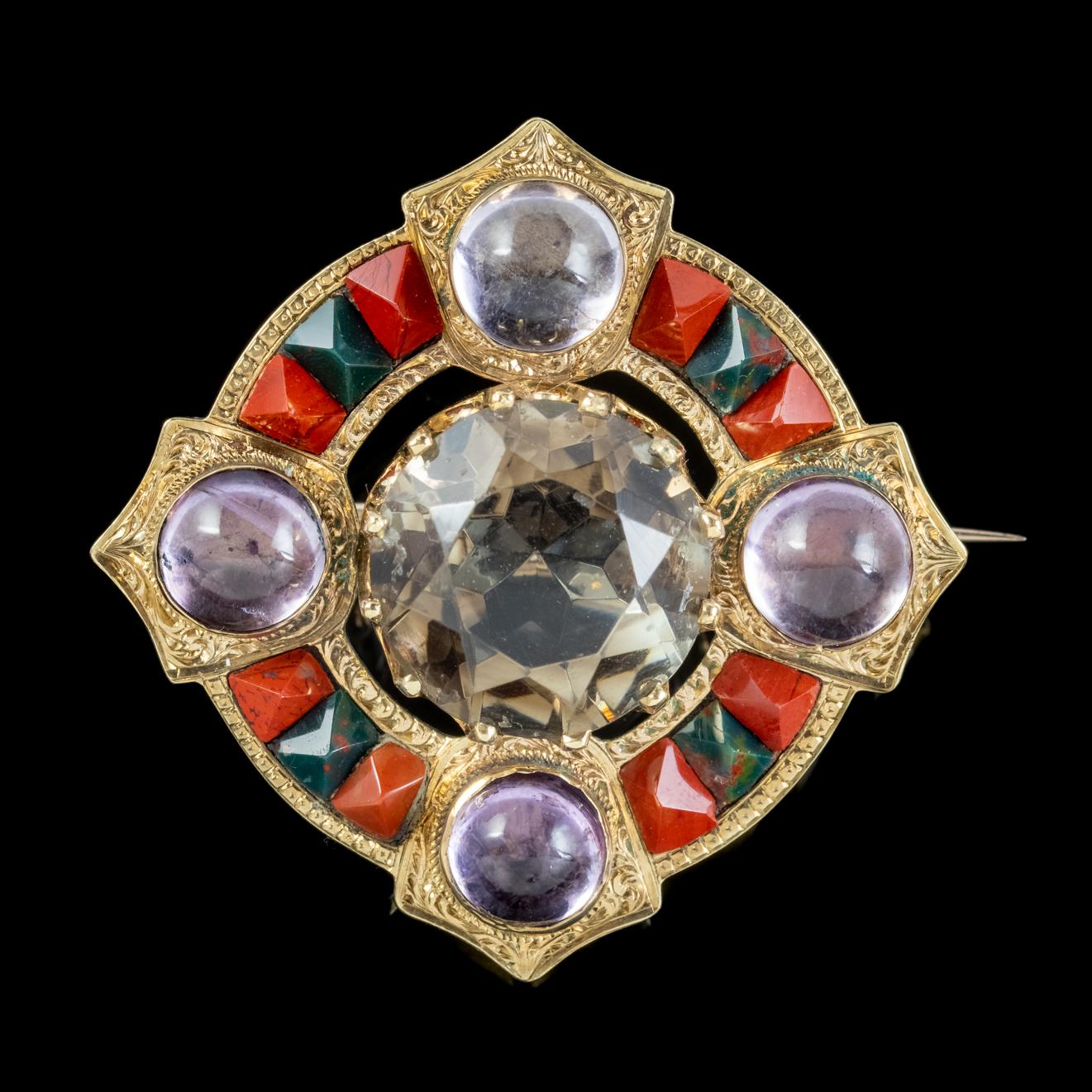 Antique Victorian Scottish Brooch Agate Quartz Amethyst 18ct Gold Dated 1868