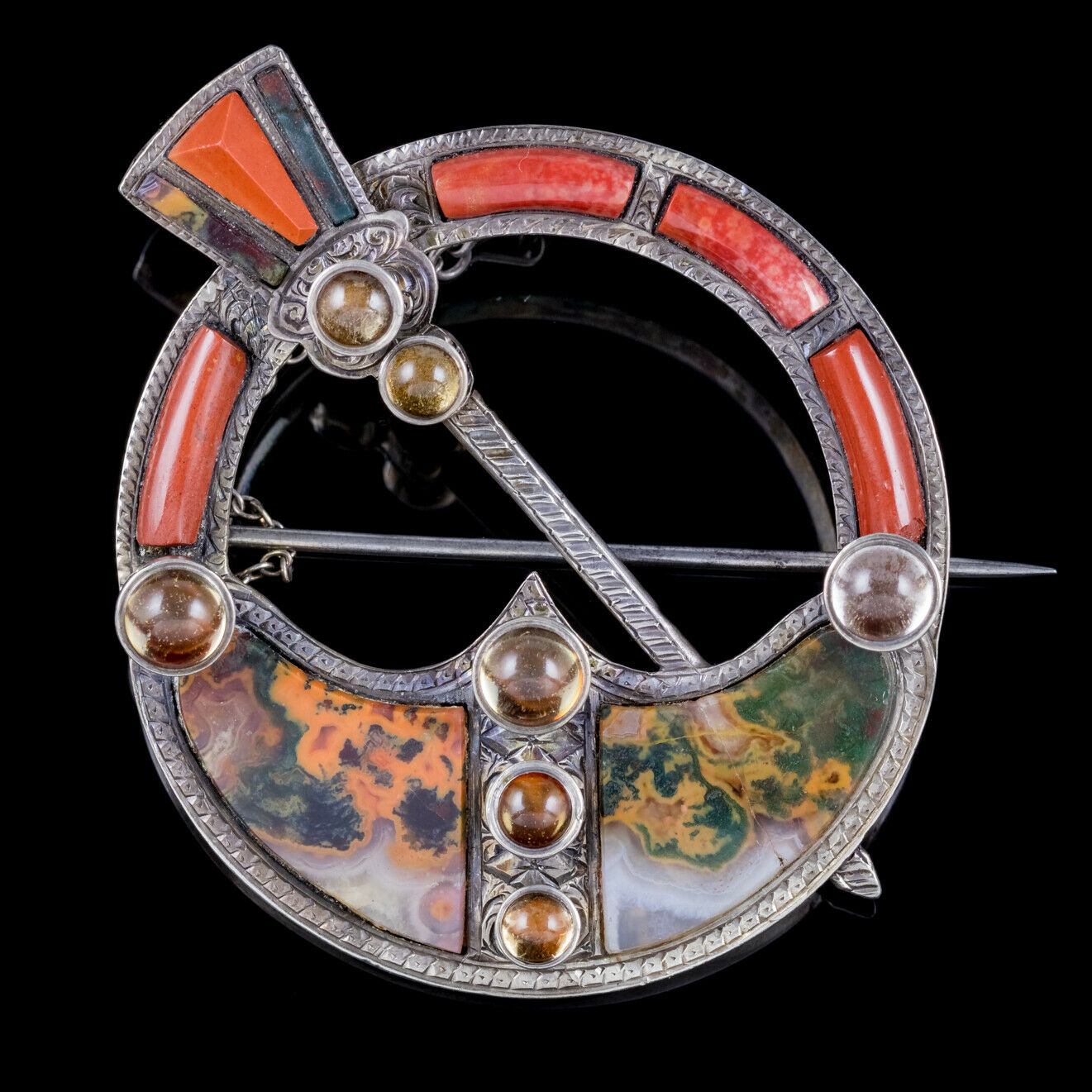 Antique Victorian Scottish Penannular Celtic Brooch Agate Citrine Silver c.1860