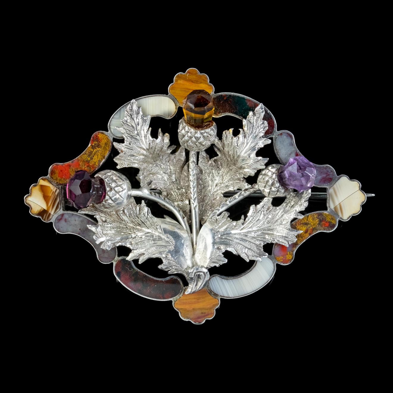 Antique Victorian Scottish Thistle Brooch Silver Agate Citrine Amethyst c.1860