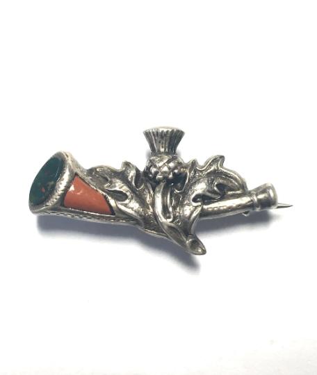 Antique Victorian Silver & Agates Scottish Themed Hunting Horn Brooch