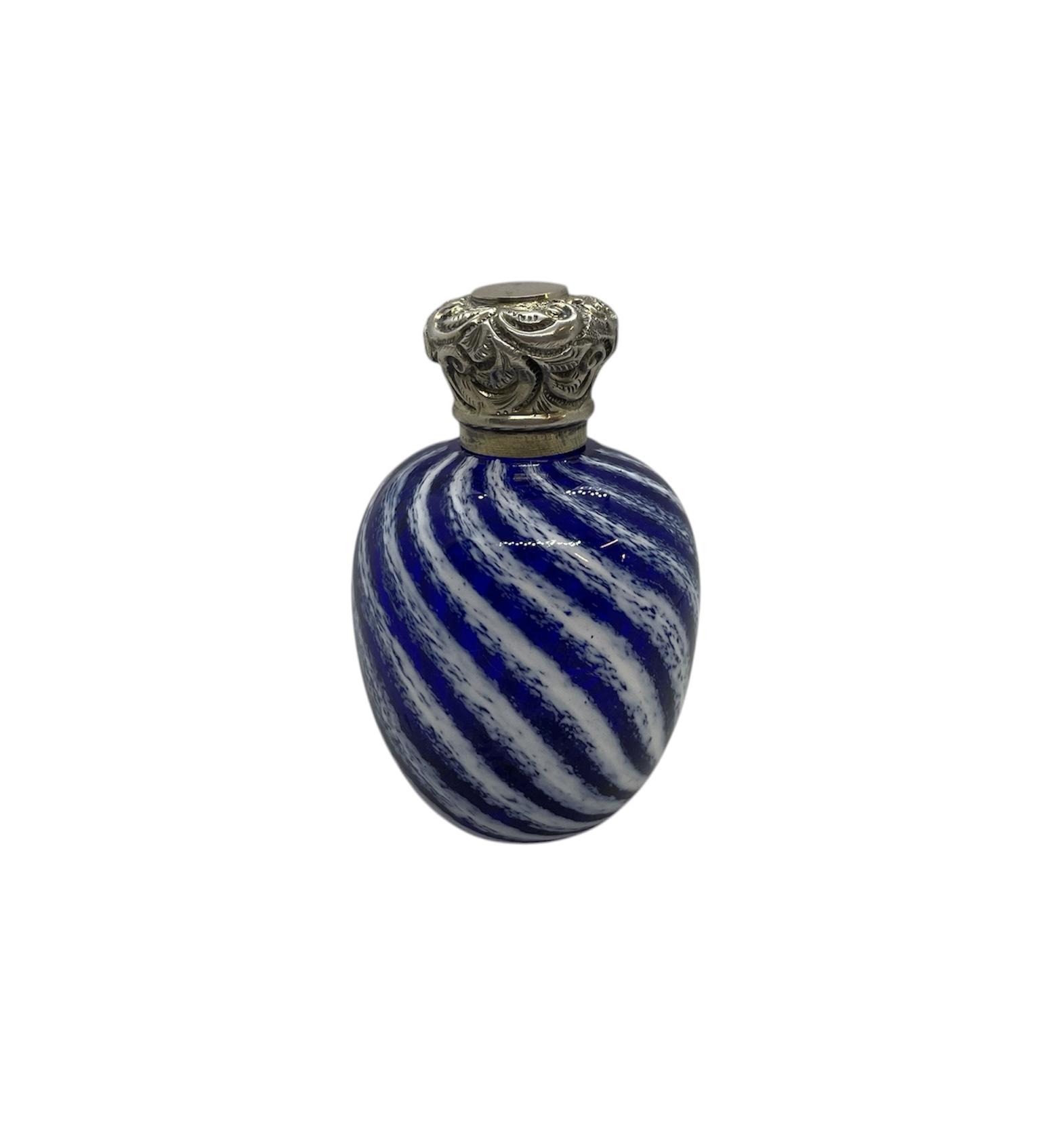 A fabulous antique Victorian silver blue swirl scent bottle. The Bristol Blue and white swirl bottle has silver repoussé screw mount. The original blue chisel stopper fits perfectly. Unmarked but has been tested as silver.
