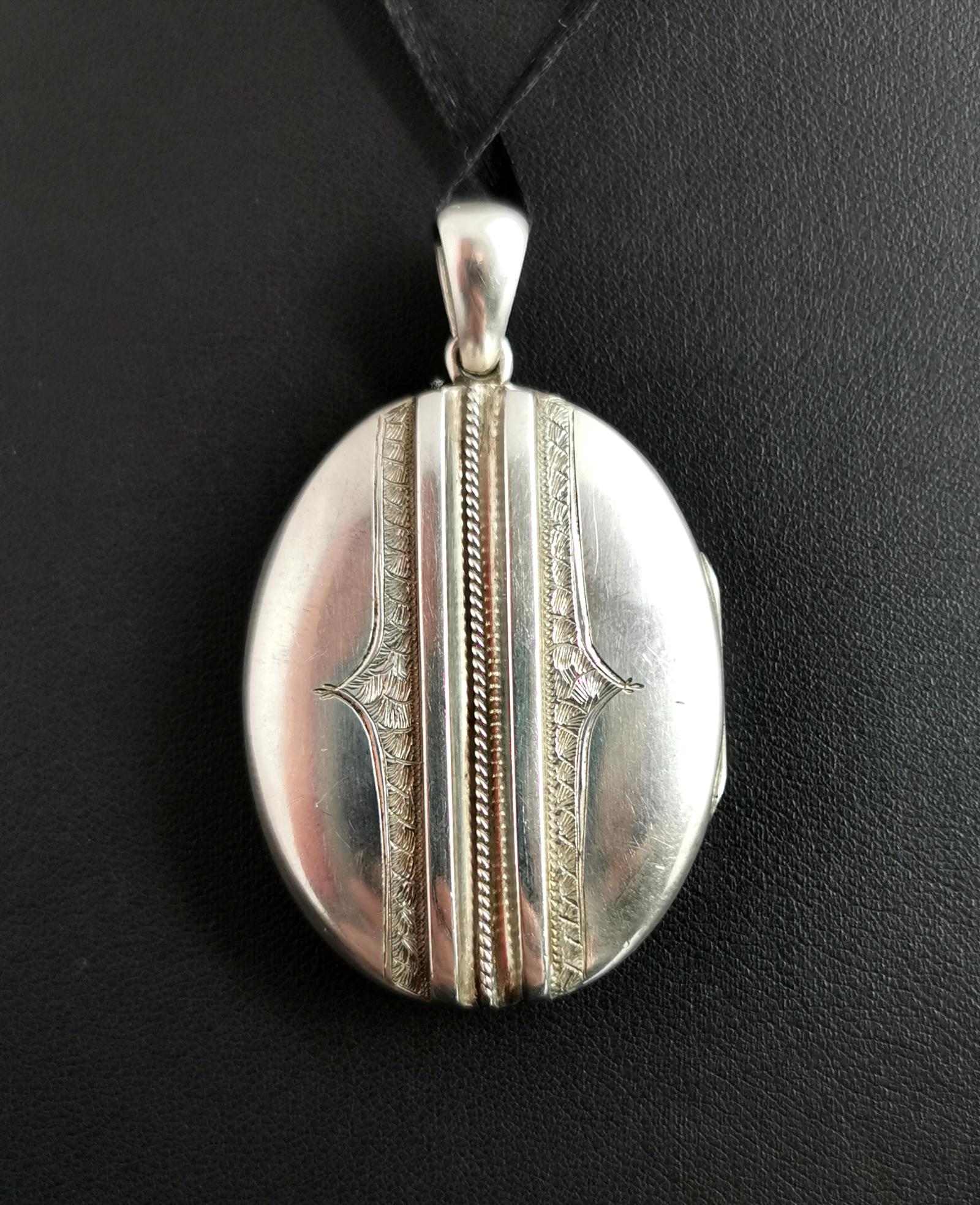 Antique Victorian Silver Locket Pendant, Line Engraved