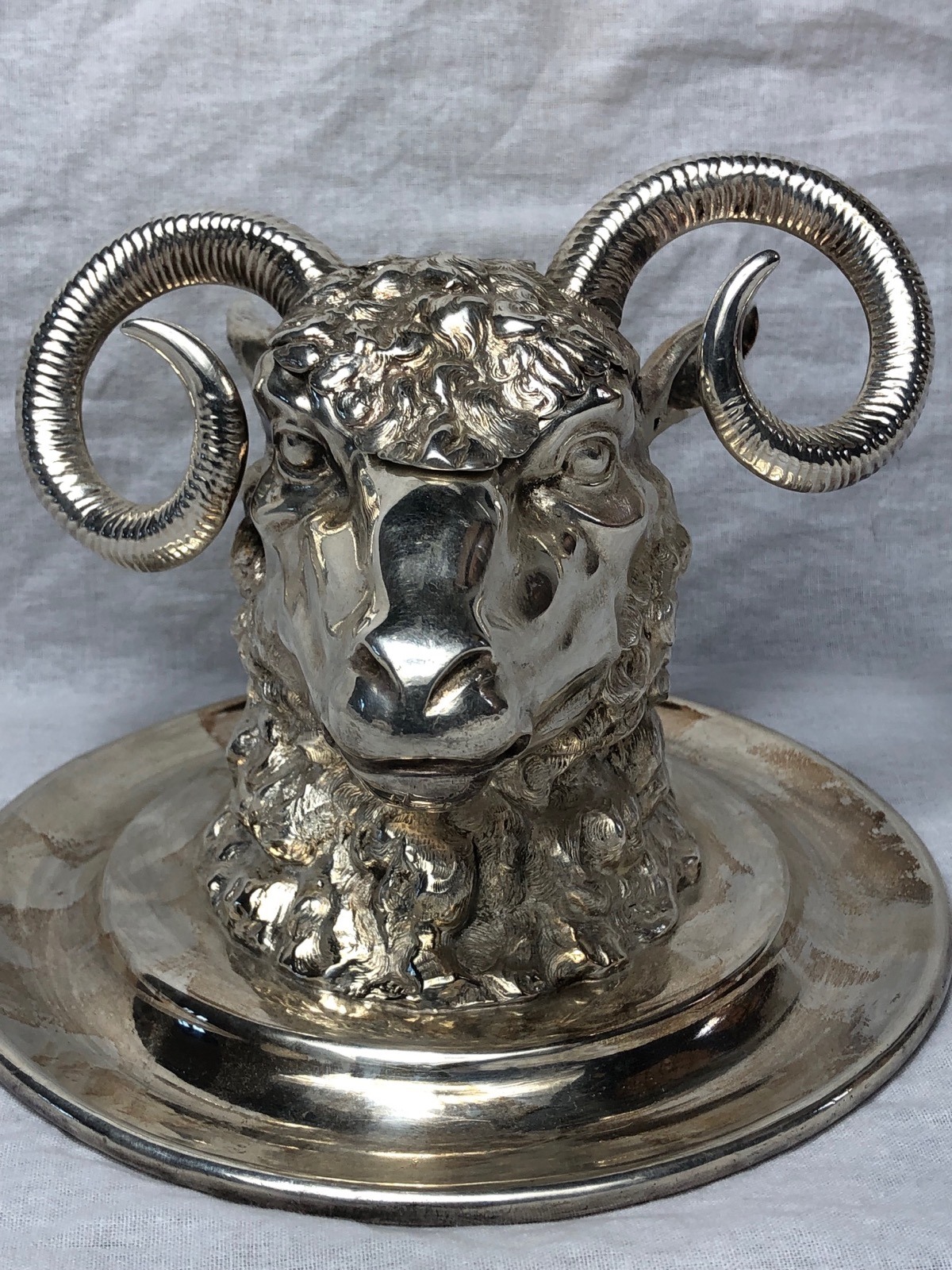 Antique Victorian Silver Plate Rams Head Animal Bust Inkwell After John Grinsell