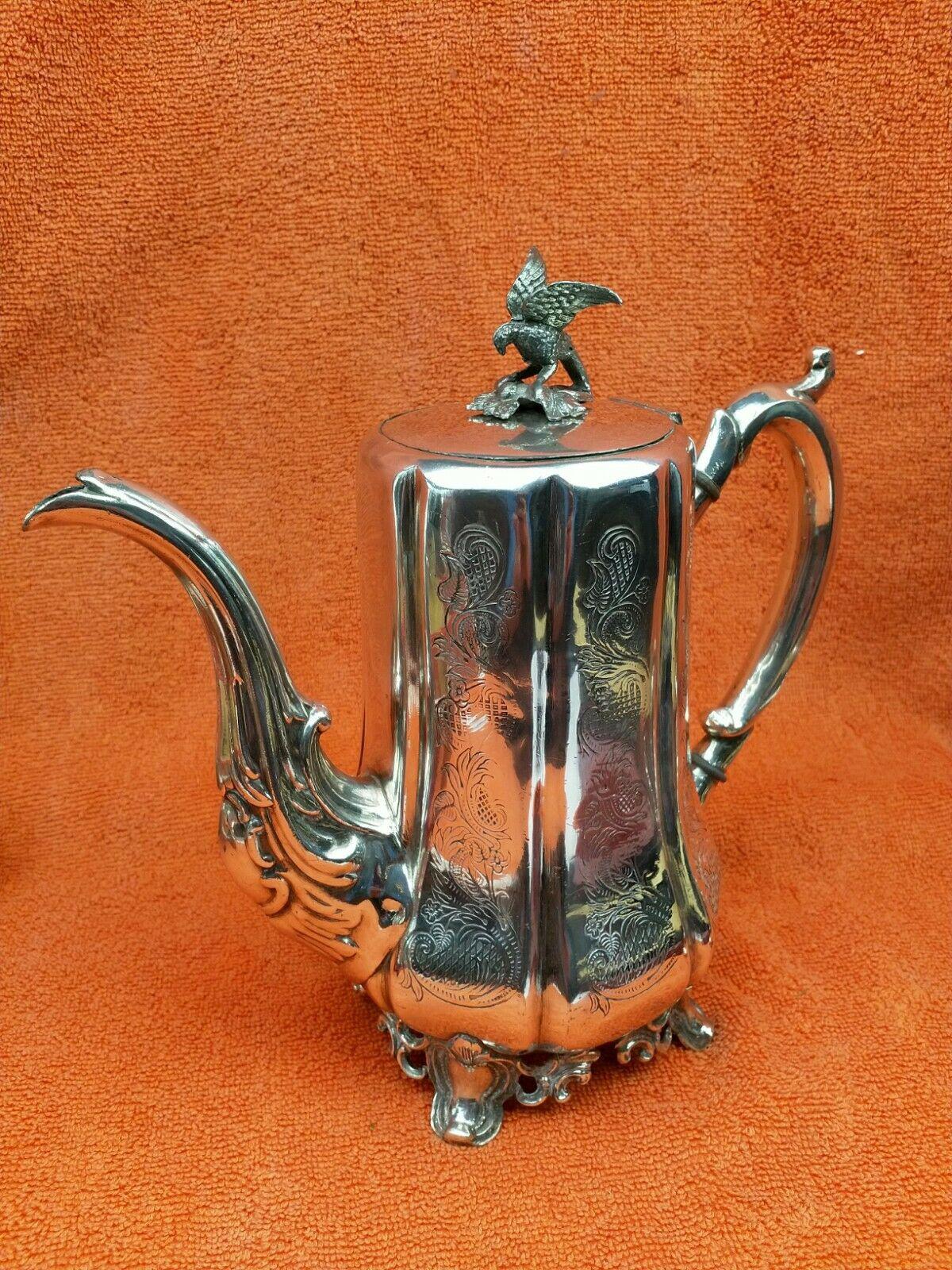 Antique Victorian Silver Plate Teapot C1870 Hand Engraved Folate Patterning with Bird, Maybe Eagle Finial