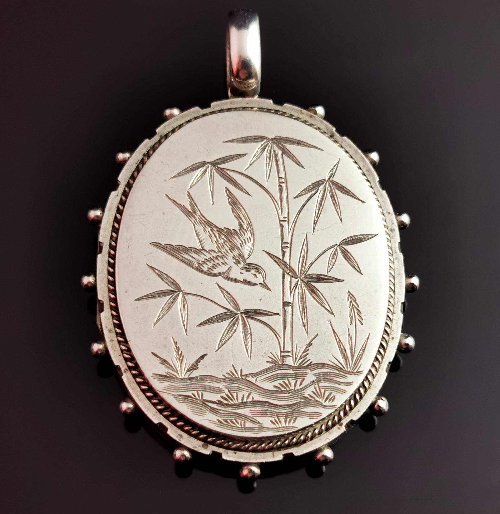 Antique Victorian Silver Swallow Locket, Aesthetic Era