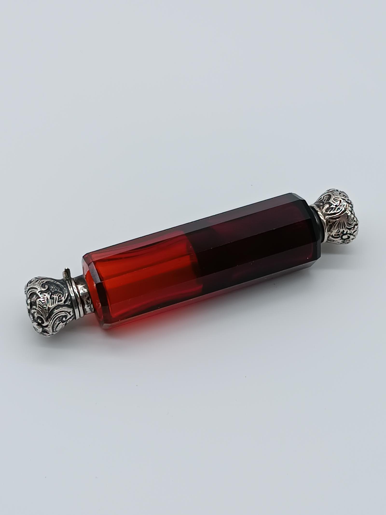 Antique Victorian Silver Topped Cranberry Glass Double Scent Bottle