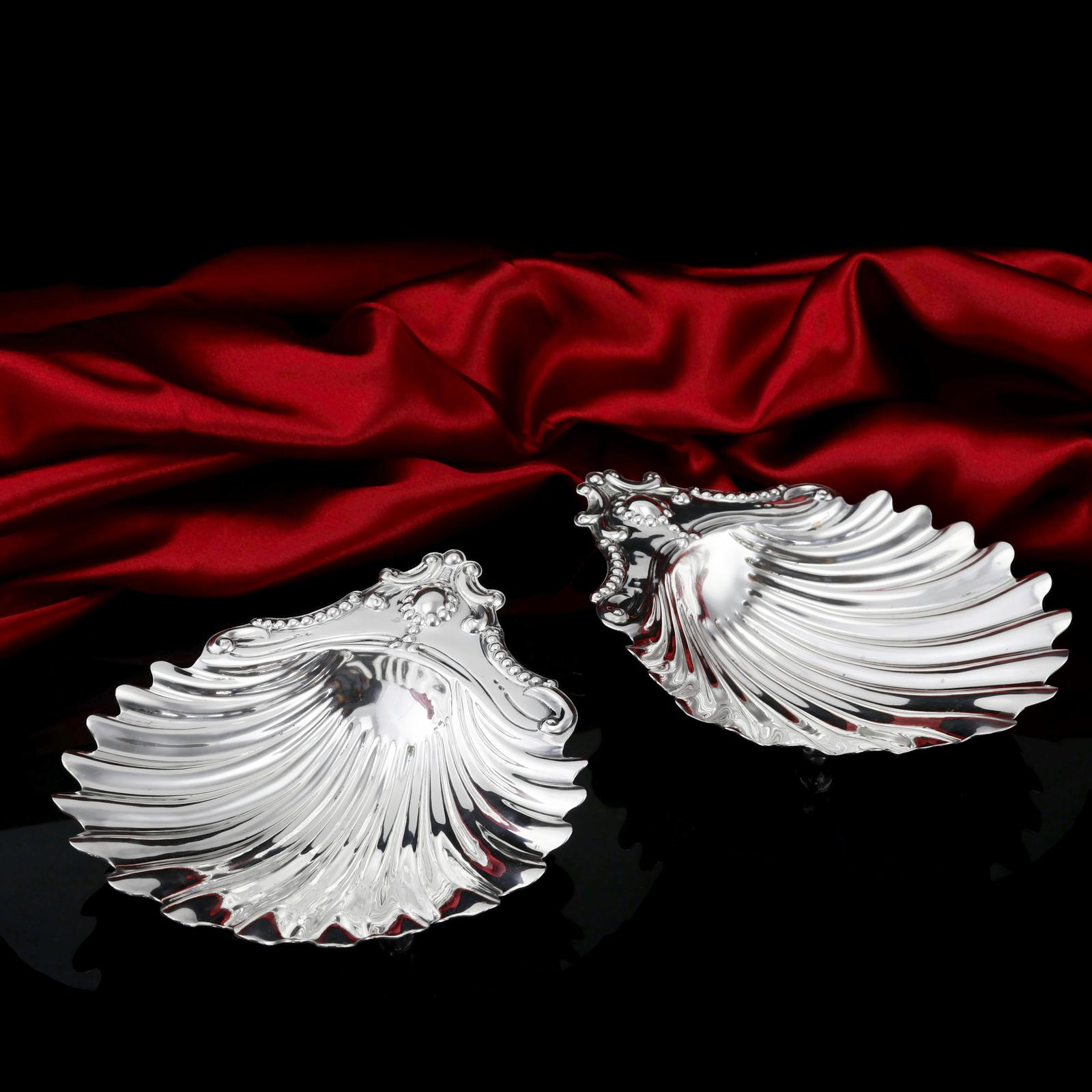 Antique Victorian Solid Silver Pair of Butter Dishes, Shell Design - Josiah Williams & Co 1894