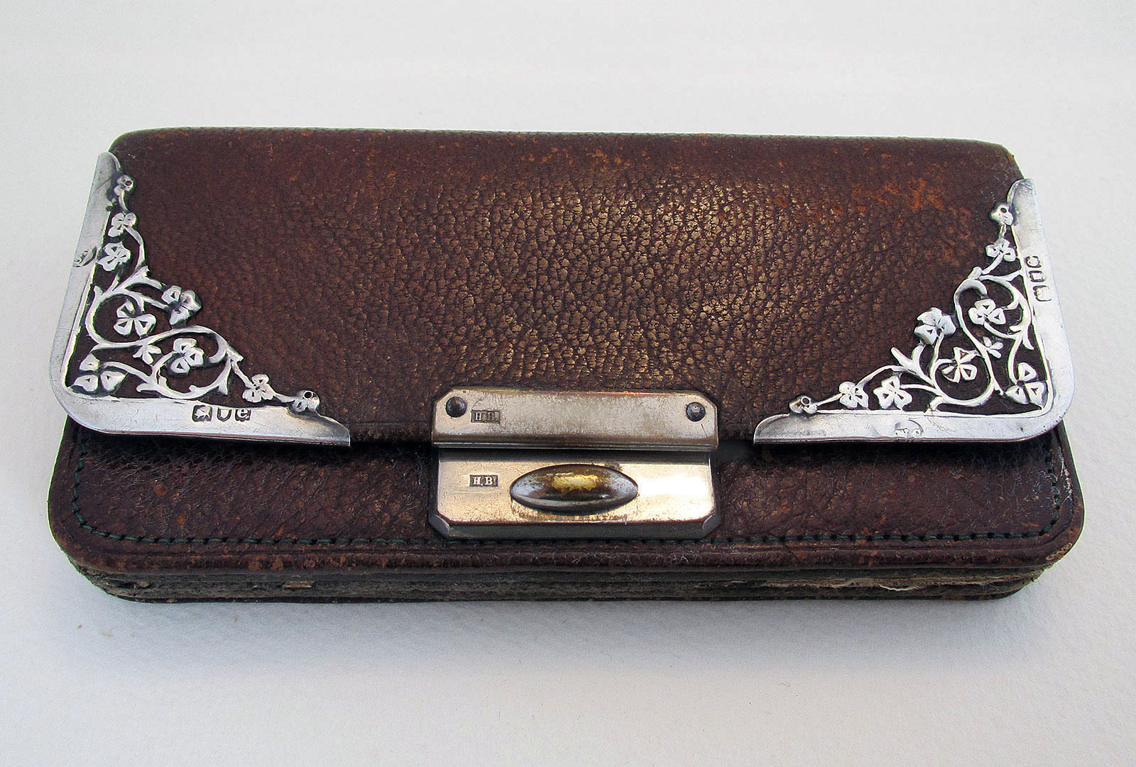 Antique Victorian Solid Sterling Silver & Leather Wallet Purse Pocket Coin Stamp Card Case, English London Hallmarked 1900