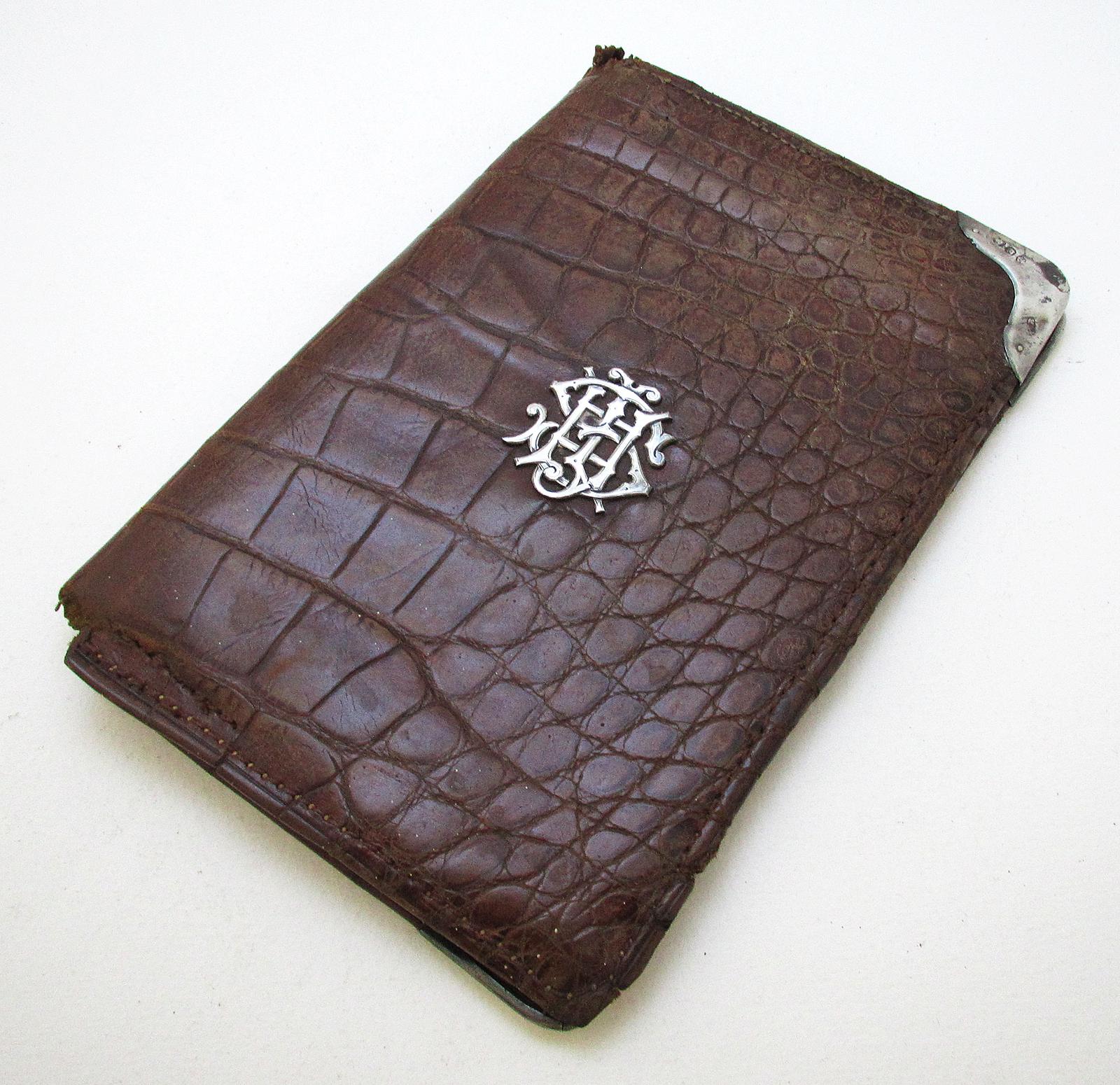 Antique Victorian Solid Sterling Silver Mounted & Crocodile Skin Leather Wallet Purse Stamp Name Card Case 1896