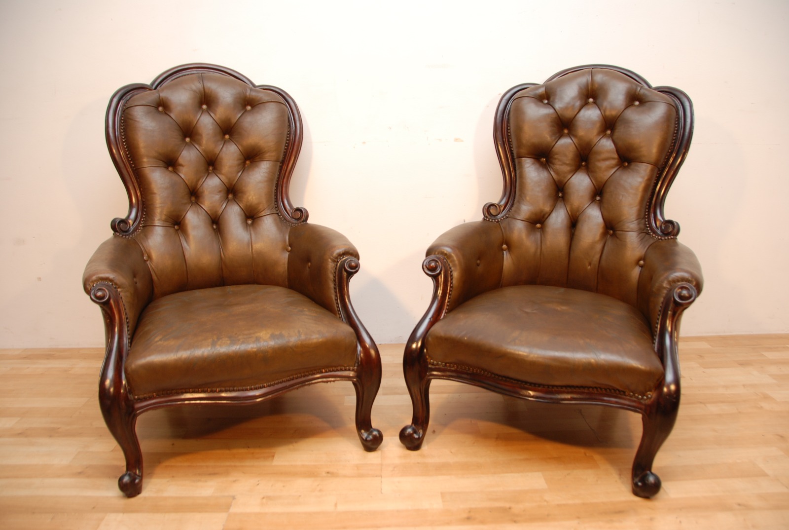 Antique Victorian Spoon Back Library Pair of Armchairs