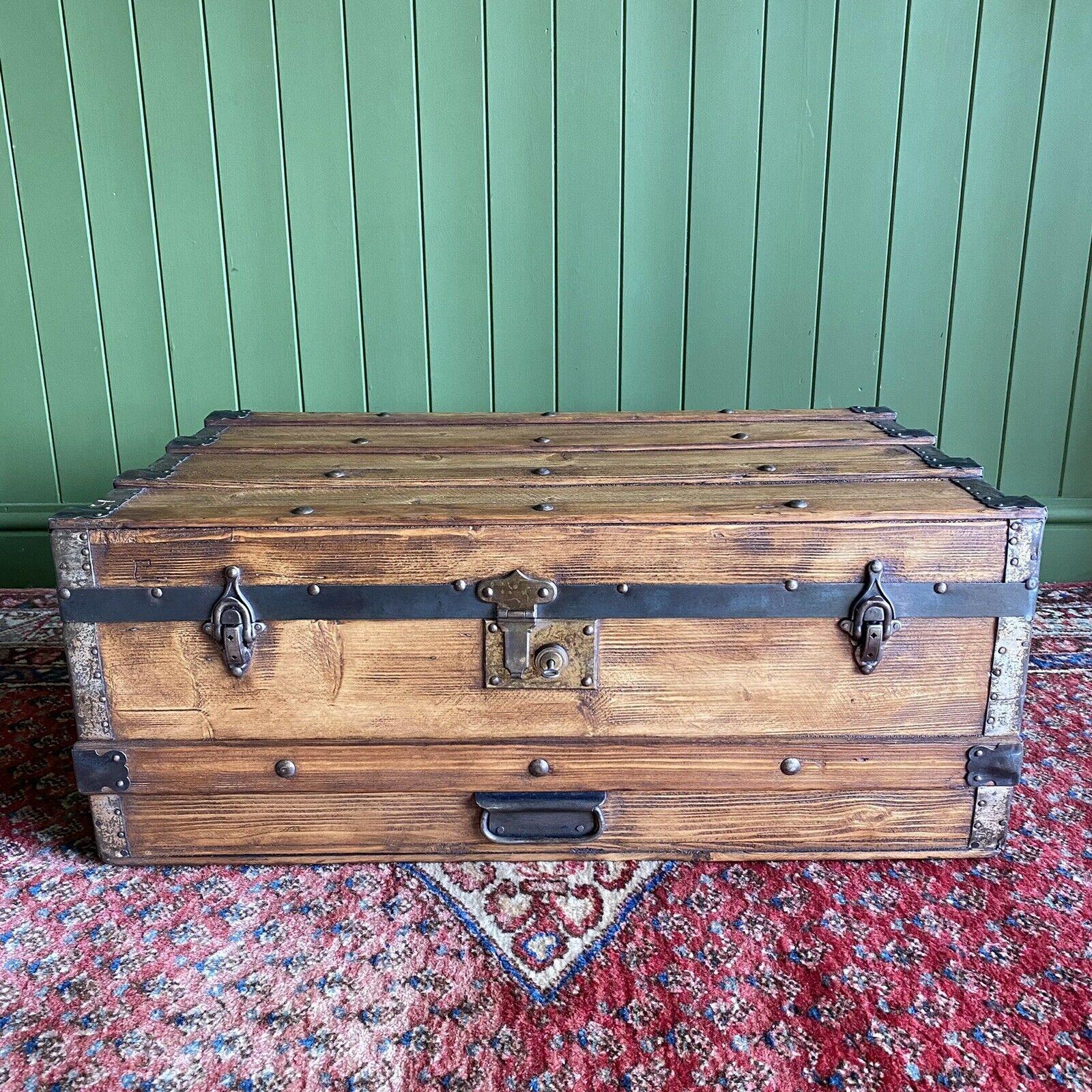 Antique Victorian Steamer Trunk Chest Coffee Table - Old Rustic Pine Storage Box + Key