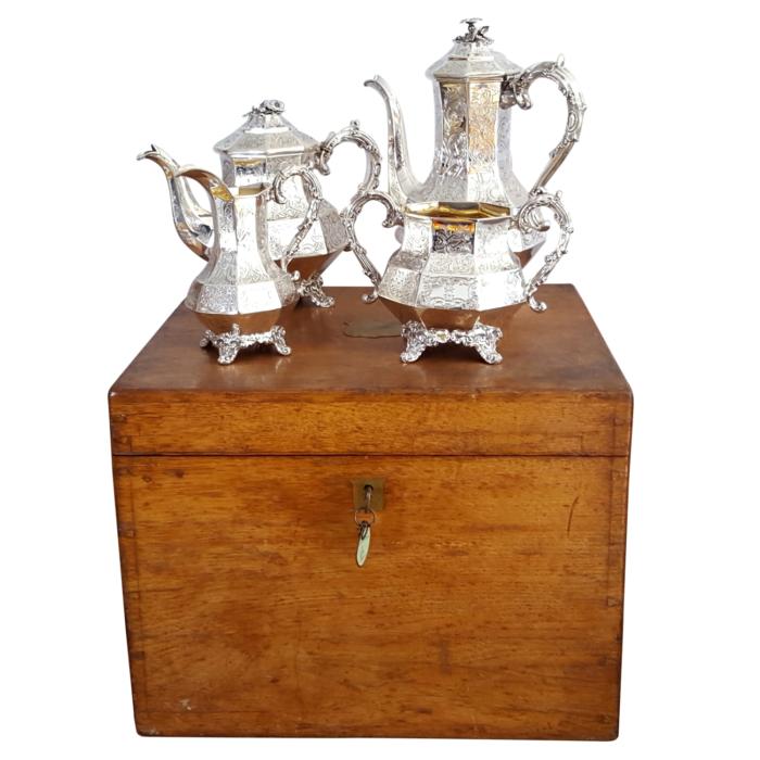 Antique Victorian Sterling Silver 4 Piece Tea Set in Oak Case with Key 1843