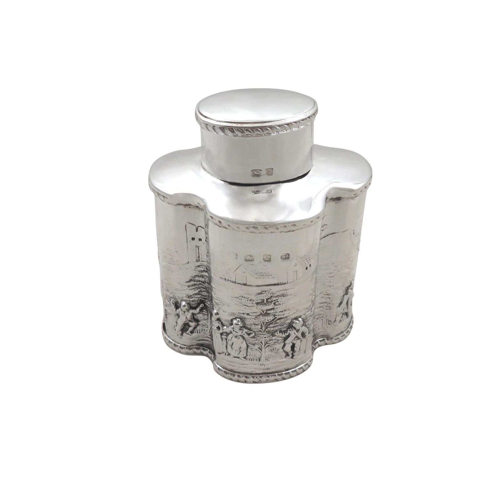 Antique Victorian Sterling Silver Caddy with Village Scenes 1899