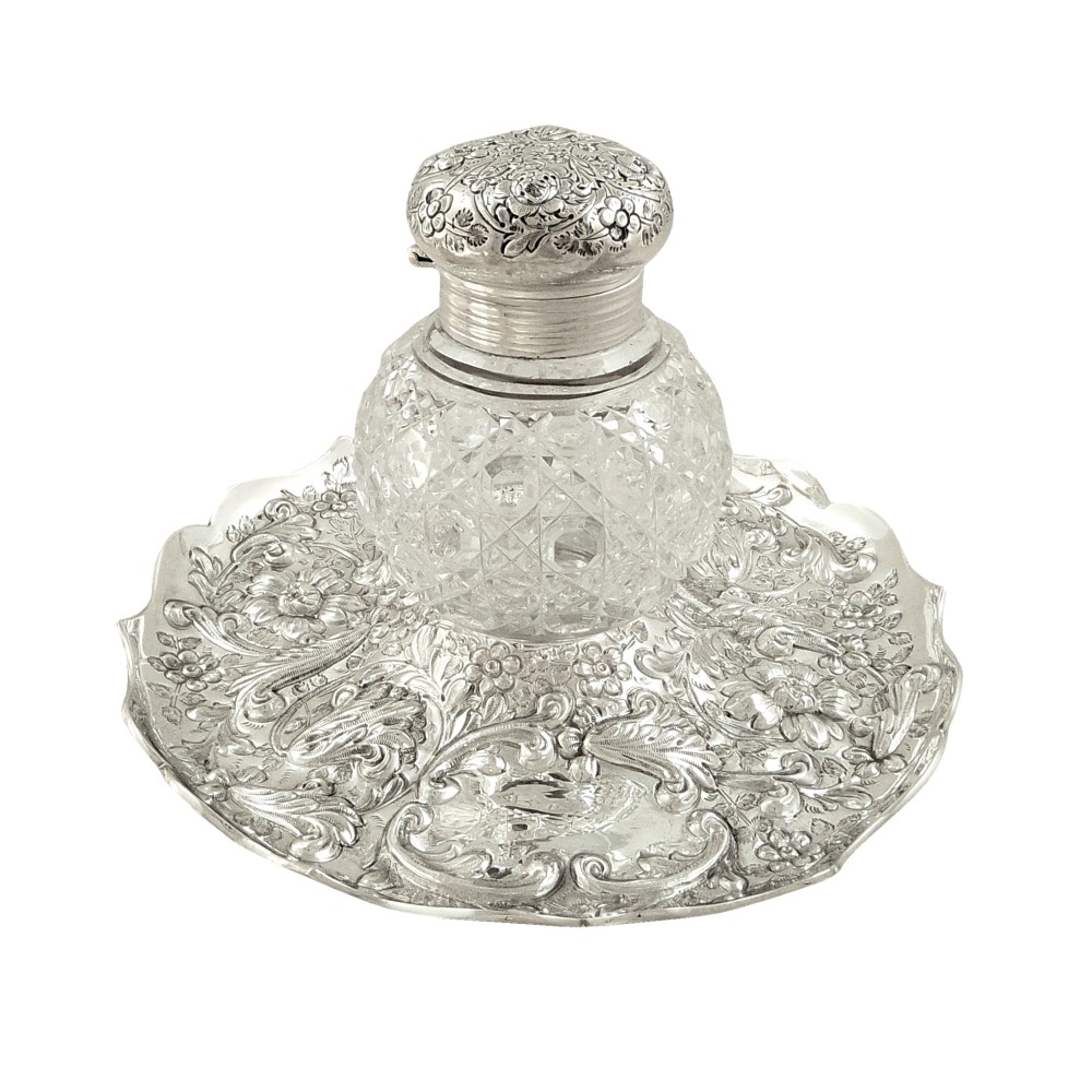 Antique Victorian Sterling Silver & Cut Glass Inkwell On Stand